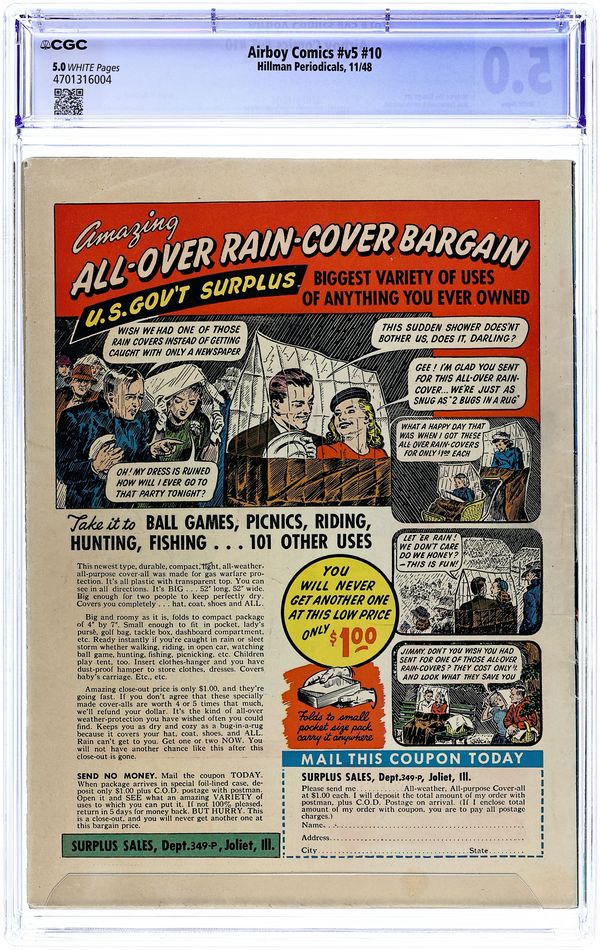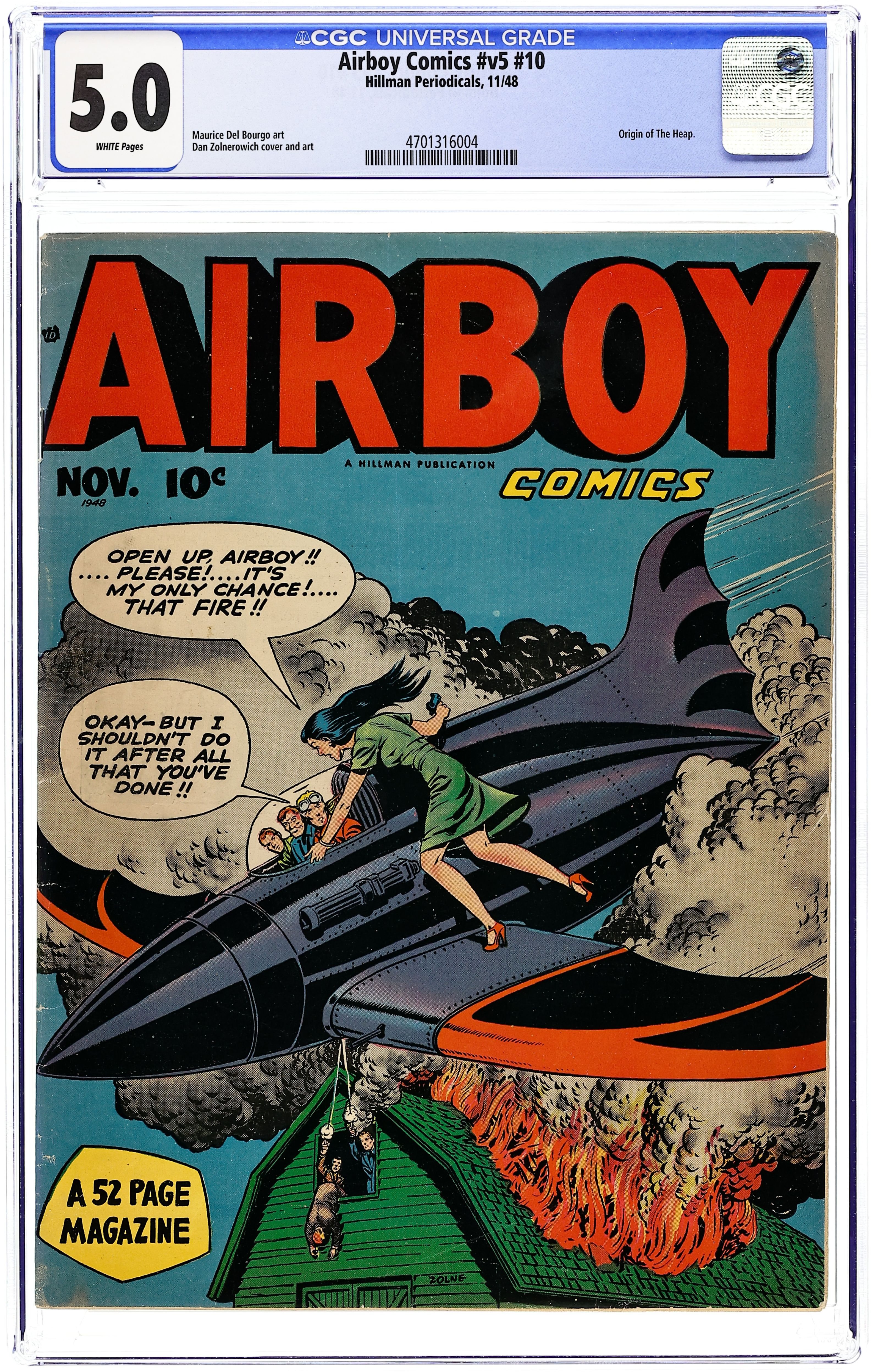 Cover by Dan Zolnerowich. Stories and art by Dick Wood, Dan Zolnerowich, Maurice Del Bourgo, and Clement Weisbacker. One of the more fanciful and influential of 1940s aviator heroes, Airboy fights evil with his radio-controlled plane "Birdie" and its plethora of experimental flying tech. Sometimes listed as Airboy Comics #57. No issue # on cover; Vol. 5, issue #10 in indicia. Airboy tries to reunite a circus owner with his son, but a redheaded femme fatale is blocking the way. The Heap steps in when a descendant of the tyrant "The Iron Duke" decides to conquer the Heap's homeland. The bandits terrorizing 1800 Bucharest seem to be wolf-men. Airboy; The Flying Fool; The Heap; The Wolf Men of Bucharest; The Pig Stickers; The River Breed. 48 pages, Full Color. Cover price $0.10.