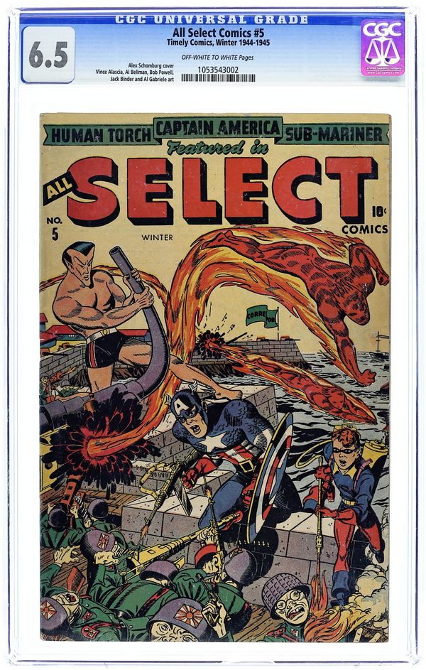 Invading the Nazis' Secret Plan, inks by Carl Burgos; Torch and Toro discover that the Nazis are operating out of a steamship anchored to a pier at Coney Island, intending to deliver a bomb [along with needed tanks of oxygen] to a hospital in order to kill thousands. Ad encouraging readers to join Cap's Sentinels of Liberty. The Vampire Strikes!, pencils by Al Avison, inks by Don Rico; Cap and Bucky must face the threat created by the world's greatest master of occult medicine, Dr. Togu, who has forsaken the dropping of disease bombs on the Chinese people to inflict yet a new terror upon America: a vampire! Speed On the Rampage starring the Whizzer, art by Howard James. The Man in the Moon text story by Mickey Spillane. The Hermit's Island of Glittering Gold starring Sub-Mariner, pencils by Bill Everett. The Demon's Deadly Secret starring the Destroyer, art by John Forte. 68 pages, full color. Cover price $0.10.