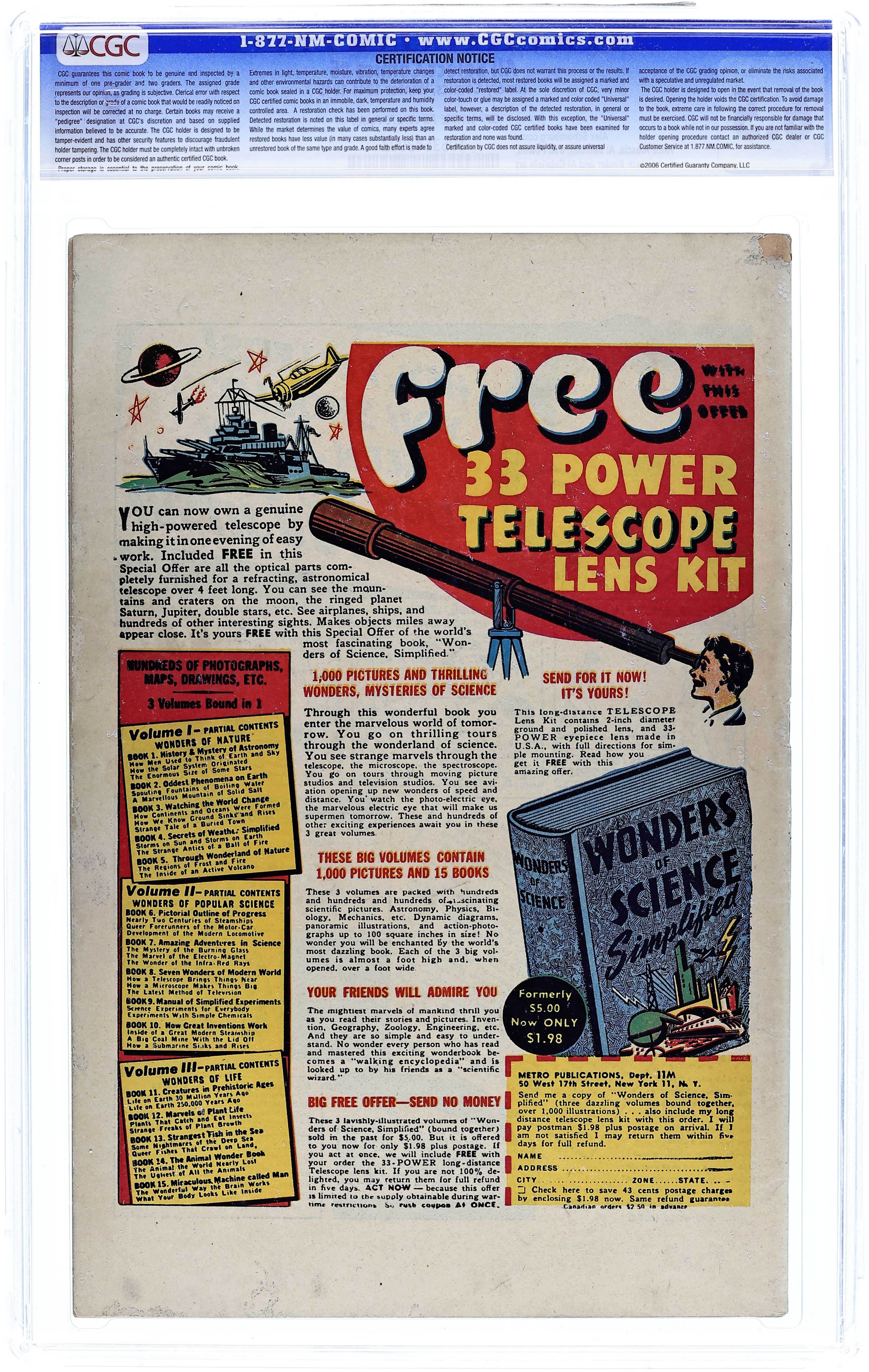Art by Frank Carin and Isadore Klein. Funny-animal hijinks featuring Space Mouse, Super Pup, Merry Mouse and Peter Rabbit. Space Mouse investigates a lost world; Peter Rabbit becomes a test pilot; Super Pup battles an alien invasion. Space Mouse: The Lost World; Super Pup: The Green Peril; Moon Rocket; Peter Rabbit: Test Pilot!; Merry Mouse: The Awful Truth! 36 pages, Full Color. Cover price $0.10.