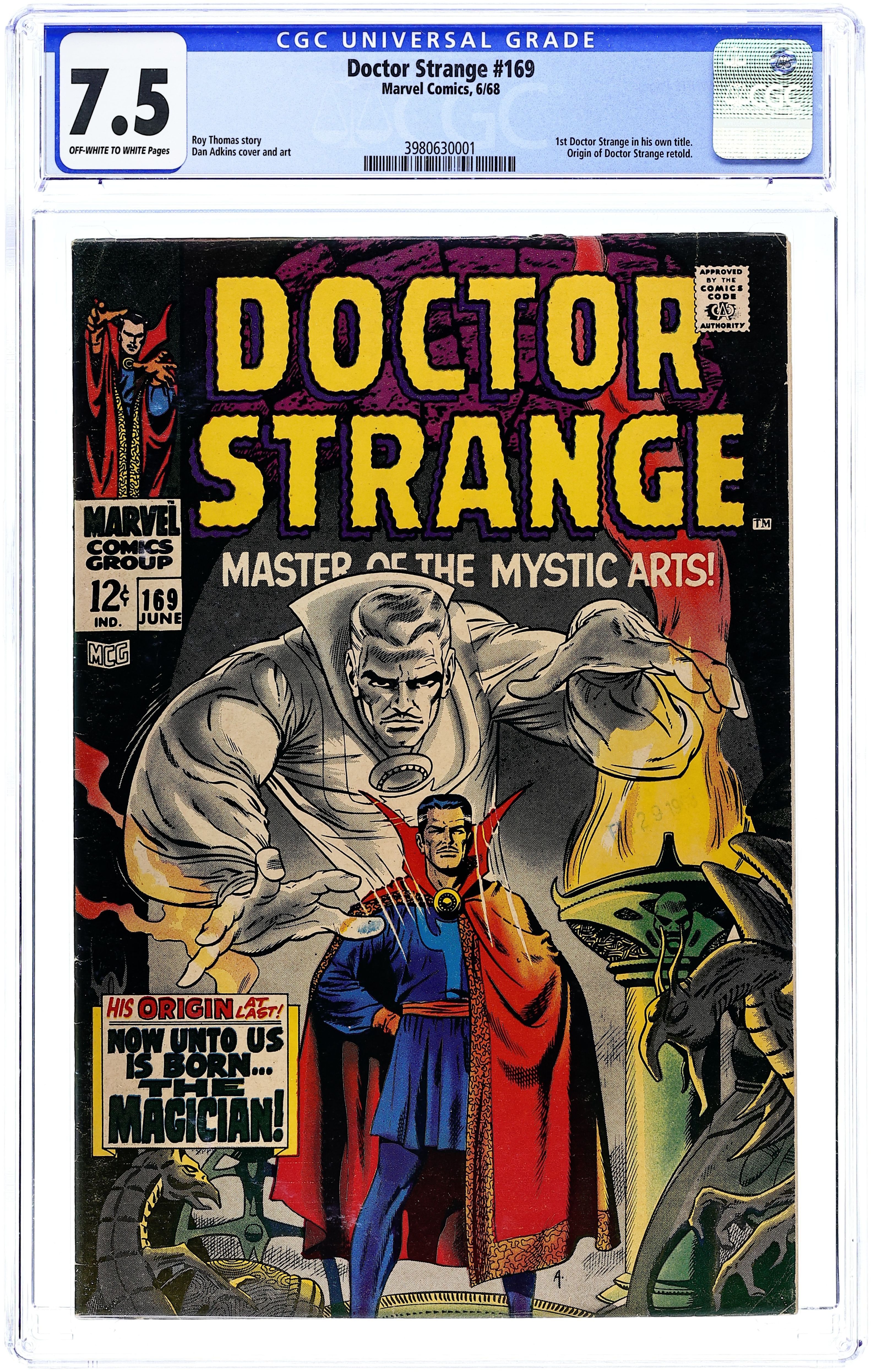 Doctor Strange stories continued from Strange Tales. 1st Doctor Strange in his own title. Cover art by Dan Adkins. The Coming of... Dr. Strange, script by Roy Thomas, art by Dan Adkins; Origin of Dr. Strange retold; Stephen Strange seeks out the Ancient One in Himalayas in hope of a cure for his damaged nerves; He discovers that Baron Mordo, a pupil of the Ancient One, is plotting to kill his teacher; Strange warns the Ancient One and then asks to study the mystic arts. House ad for Amazing Spider-Man #61 and Thor #152. Letter to the editor from comics historian George Olshevski. 36 pgs. $0.12. Cover price $0.12.