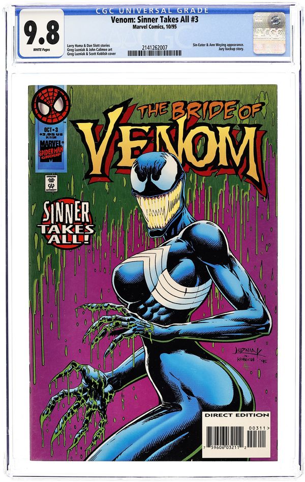Pop quiz, Venom: the new Sin-Eater is out to kill your ex-wife and you're powerless to stop him--what do you do?! Written by Larry Hama. Art and cover by Greg Luzniak and Scott Koblish. Plus: bonus back-up story featuring the Jury. 48 pages. Cover price $2.95.