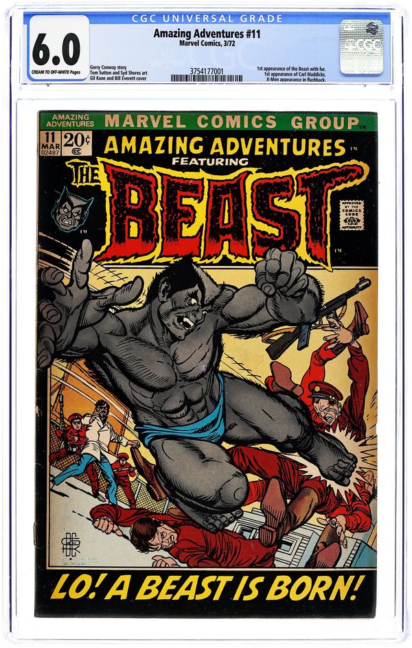 Cover pencils by Gil Kane, inks by Bill Everett. First appearance of the Beast in mutated form in "The Beast!", script by Gerry Conway, pencils by Tom Sutton, inks by Syd Shores; Beast leaves the X-Men to take a job at the Brand Corporation; While experimenting with his mutation, he is permanently changed into a furry monster; Brief appearance by the original X-Men. 36 pgs, full color. $0.20. Cover price $0.20.