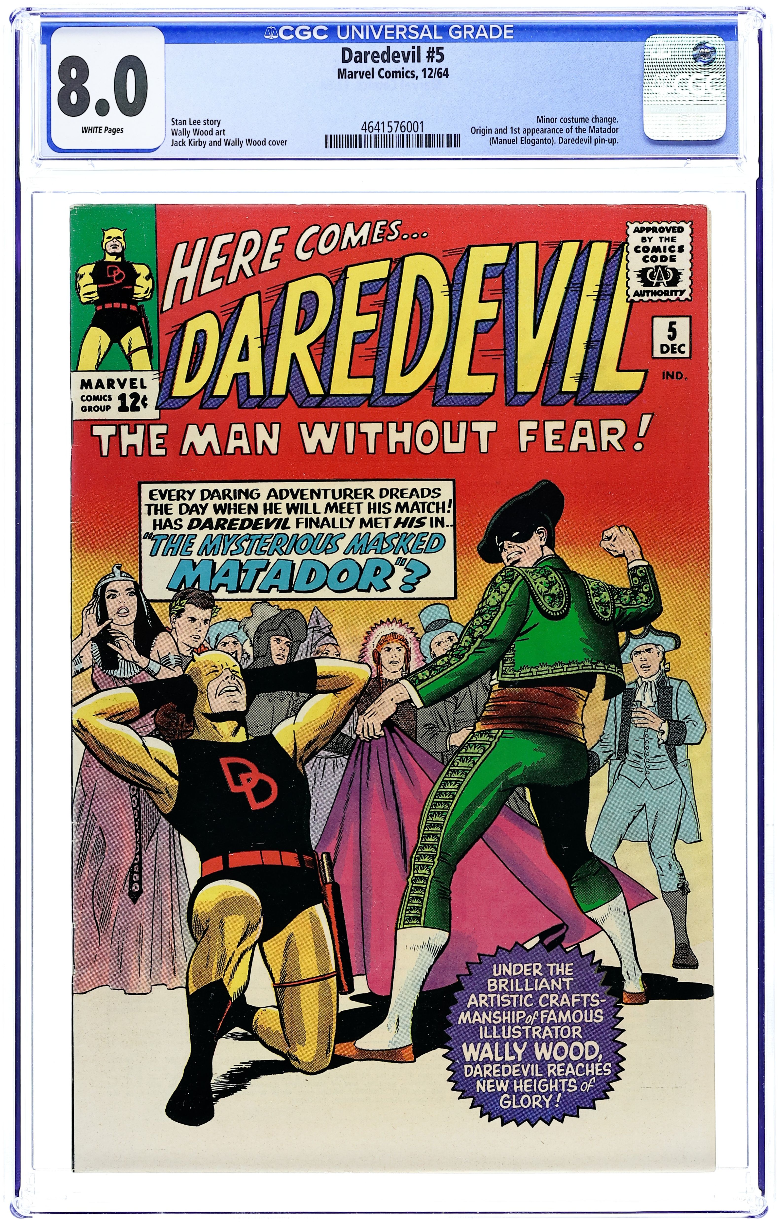 Cover pencils by Jack Kirby, inks by Wally Wood. First appearance of the Matador in The Mysterious Masked Matador!, script by Stan Lee, art by Wally Wood [as Wallace Wood]; A disgraced matador turns criminal to have his revenge on humanity; Daredevil stops the criminal's incessant cape waving. Daredevil's costume now has "DD" instead of just a "D." Daredevil pin-up (Wood art, though the buildings look like they were penciled by Jack Kirby). 36 pgs. Cover price $0.12. Cover price $0.12.