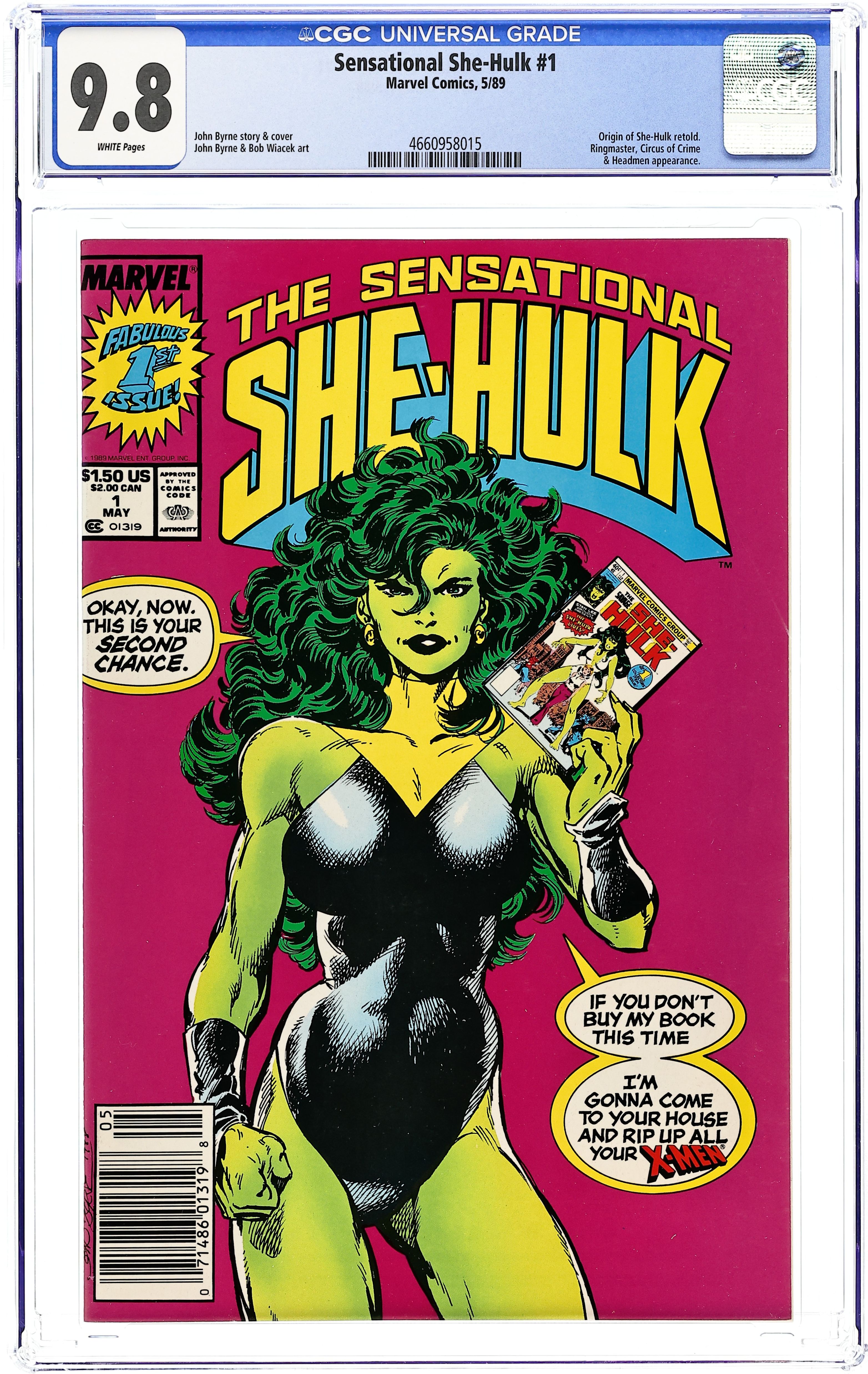 Direct Edition. 1st appearance and origin of the She Hulk. "The She-Hulk Lives!" Guest-starring Bruce Banner. Story by Stan Lee. Art by John Buscema and Chic Stone. Jennifer Walters is on the verge of death after an attempted assassination, and the only thing that will save her life is a blood transfusion from her cousin, Bruce Banner...AKA the Incredible Hulk! His gamma-irradiated blood sparks a startling transformation in his cousin, and she will forevermore be known as the Savage She-Hulk! Cover price $0.40.