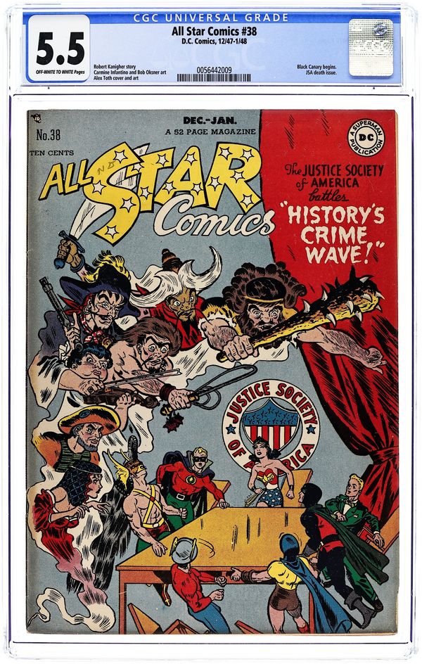 The Justice Society of America battles "History's Crime Wave!" Appearances by Genghis Khan, Attila, Nero, Goliath, Cesare Borgia, and Capt. Kidd. JSA roll call Hawkman, the Flash, Green Lantern, the Atom, Dr. Mid-nite, Johnny Thunder, and Wonder Woman. Black Canary guest stars and begins her regular appearance in the title. Script by Gardner Fox. Art by Alex Toth, Carmine Infantino (with Frank Giacoia inks), and Bob Oksner. Two-page text story, "The Chief Returns a Gift" by Charles King. One-page Tootsie Roll ad, "Captain Tootsie and the Radar Rescue" by C.C. Beck and Pete Costanza. Toth cover. 52 Pages, Full Color. Cover price $0.10.