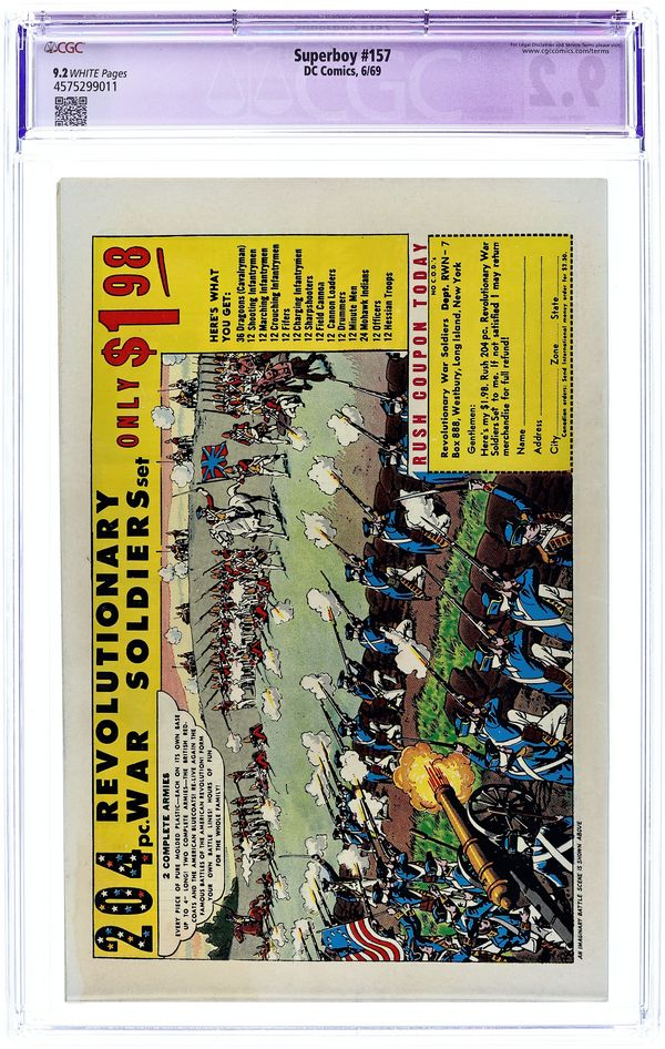Cover pencils by Curt Swan, inks by Stan Kaye. Rebello, the Human Robot!, script by Otto Binder, art by John Sikela; Superboy builds his first robot capable of independent thought and it rebels against him. The Brave and the Bold #23 ad. What's Your B. Q.*? (*Brotherhood Quotient) public service announcement, script by Jack Schiff, art by Bernard Baily. The Day Superboy Was a Coward, script by Otto Binder, art by George Papp; Superboy loses all confidence after he apparently kills an escaping criminal. Varsity Vic humor page by Henry Boltinoff. The Flying Girl of Smallville!, script by Jerry Coleman, art by Creig Flessel; Lana Lang tricks Superboy into giving her the power to fly and, if they stay together for a continuous three hours, Lana will gain the power permanently. 36 Pages, Full Color. Cover price $0.10.