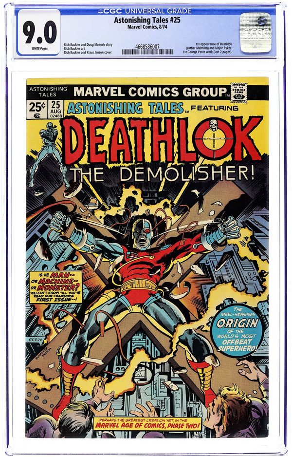 This issue not only marks George Perez's first pro comic art, but the first appearance of Deathlok! Cover pencils by Rich Buckler, inks by Klaus Janson. A Cold Knight's Frenzy, script by Rich Buckler (Plot; Concept) and Doug Moench (Script), pencils by Rich Buckler, inks by Rich Buckler (Primary Inks), Klaus Janson (Ink Assist), Al Milgrom (Ink Assist), and Mike Esposito (Ink Assist); Deathlok is shown to be a robot with a human mind that has the ability to override its programming; Deathlok has a flashback showing that his old army buddy Major Simon Riker is responsible for his creation. Stan Lee's Soapbox, art by Rich Buckler. Creation of Deathlok article, art by Rich Buckler. Promo for Giant-Size Spider-Man #1. Deathlok creation satire, script by Doug Moench, pencils by George Perez, inks by Mike Esposito; George Perez' first published work. Marvel Value Stamp #68 featuring Daimon Hellstrom [Son of Satan]. 36 pgs. $0.25. Cover price $0.25.