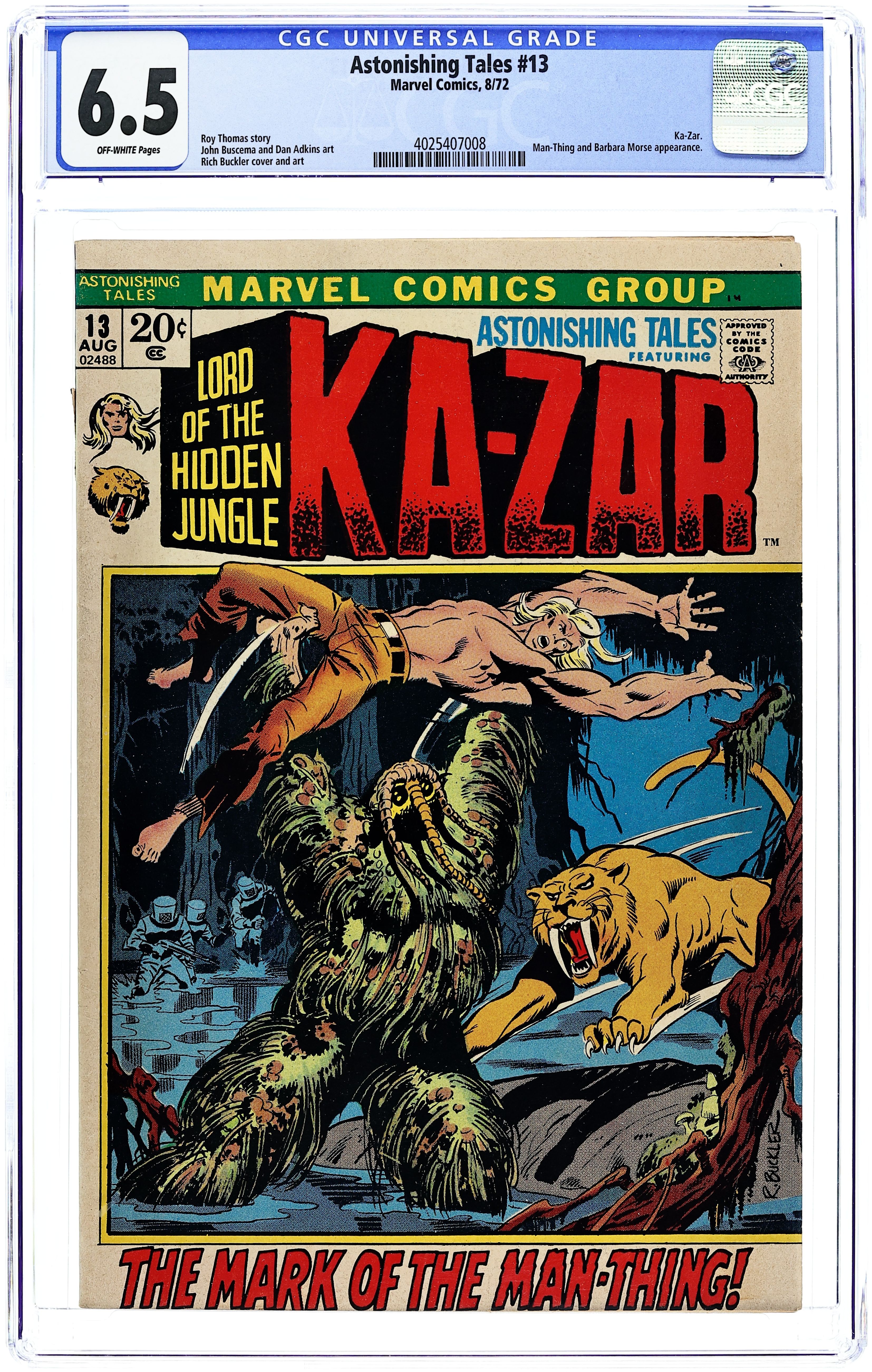 Cover pencils by John Buscema, inks by Joe Sinnott. Terror Stalks the Everglades!, script by Roy Thomas (pages 1-9, 17-21) and Len Wein (pages 10-16), pencils by John Buscema (pages 1-9, 17-21), Neal Adams (pages 10-16), and John Romita (touchups) (pages 10-16), inks by Dan Adkins (pages 1-9, 17-21), none (pages 10-16); Ka-Zar and Zabu fly to the Everglades to help Barbara Morris and Paul Allen search for Ted Sallis; Once there they encounter the Man-Thing and AIM agents; Also, the back story of how Dr Calvin was shot after the origin tale of Man-Thing in Savage Tales #1 is told. Cover price $0.20.