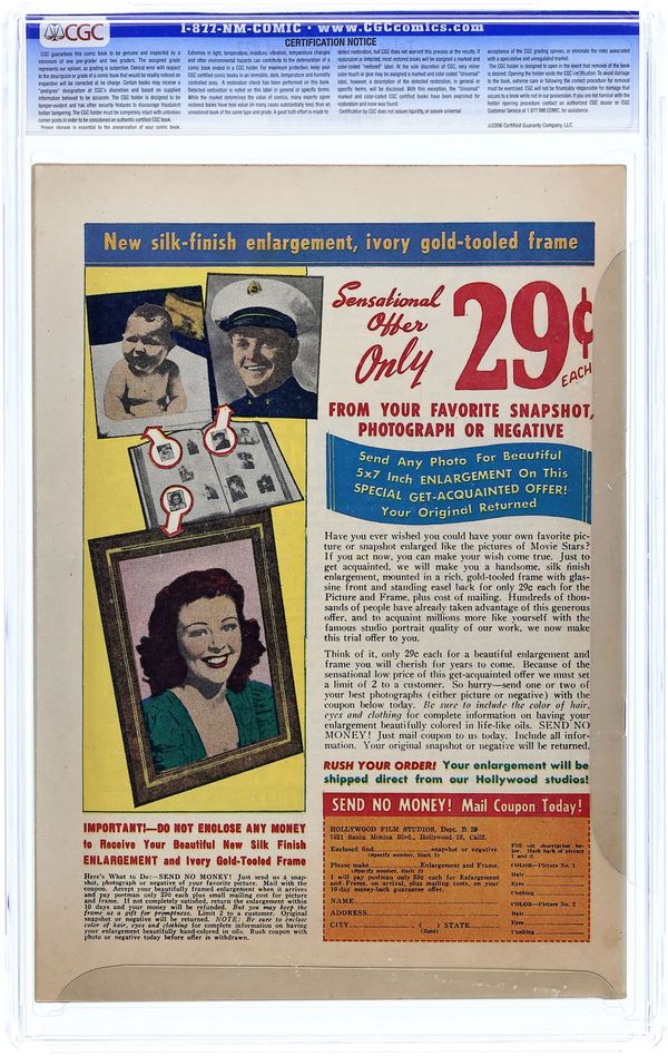 Starts Jul 4 First issue of the series (continues from The Crypt of Terror). Cover by Johnny Craig. "The Thing From the Sea," script and art by Al Feldstein; During a sea voyage a passenger discovers that stateroom 13 has the reputation of being haunted. "A Fatal Caper," script by Al Feldstein, art by Jack Kamen; Teenagers remove a body from a casket in order to dress as a mystically-summoned monster and place one of their own inside as a prank; the undertaker is unaware of this and buries the body. "Backfire" text story. "Rx...Death," script by Al Feldstein, art by Graham Ingels; A sister worries that her brother is under too much stress and so asks a doctor to write a prescription for some medicine. "Impending Doom," script by Al Feldstein, art by Johnny Craig; An artist draws a frightened face with a circle around it; Thinking it odd, he goes for a walk encountering a grave-stone cutter who looks like the picture he drew carving a tombstone with his name on it. 36 pgs., full color. $0.10. Cover price $0.10.