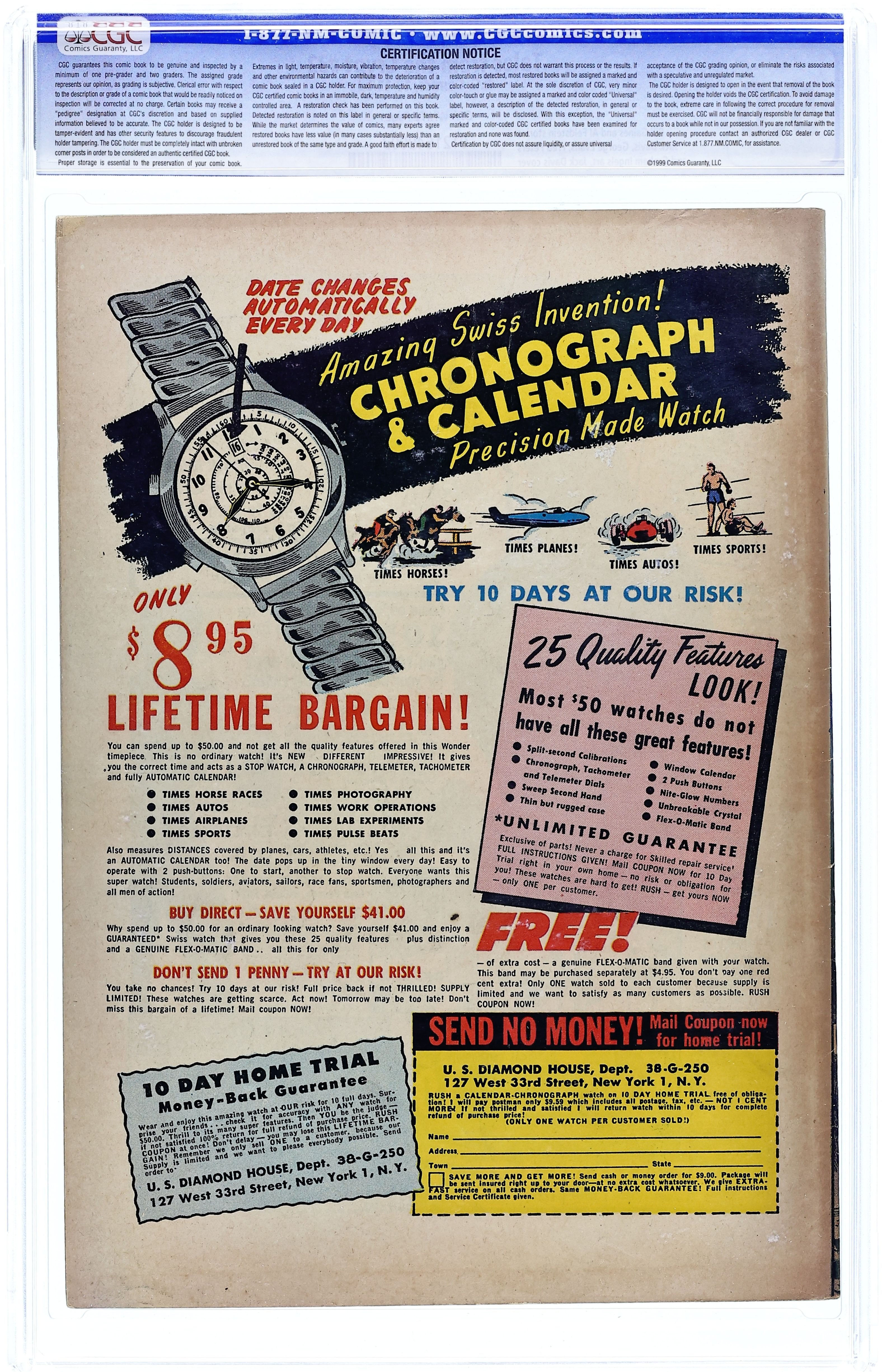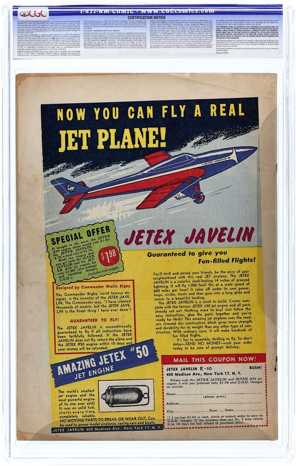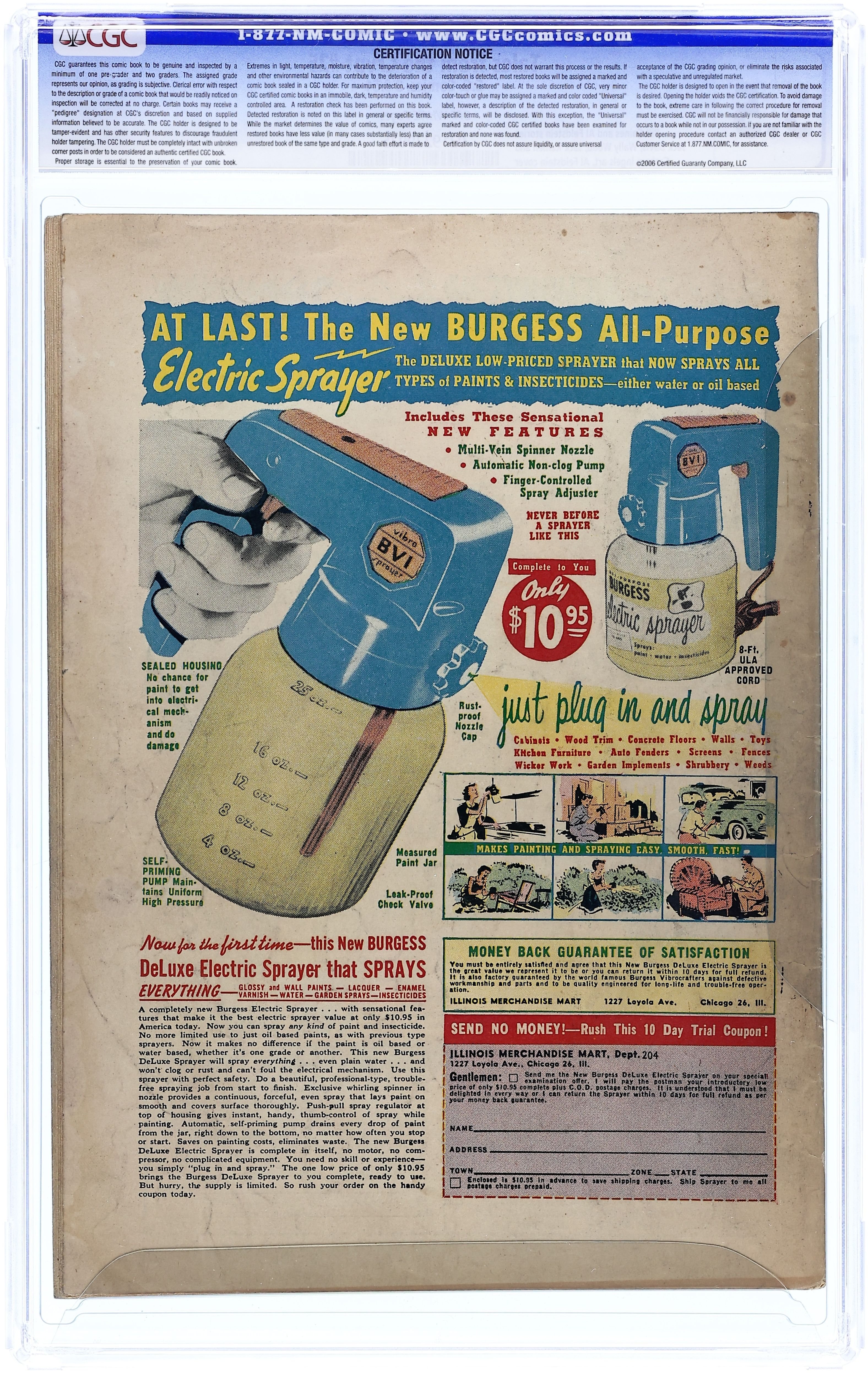 Cover by Jack Davis. "Operation Friendship," script by Otto Binder, art by Jack Davis; A mad surgeon cuts out 75% of his married friend's brain so that he can maintain it in a vat and enjoy the mental stimulation of his company while his dumb wife gets the remaining 25% of his brain and his body. "Come Back, Little Linda," script by Al Feldstein, art by George Evans; In order to save money, the management of an insane asylum moves the patients into dungeon cells that the hospital was built on. "Air-Tight" text story. "Current Attraction," script by Al Feldstein, art by Jack Kamen; A circus father attempts to get the knife thrower out of his daughter's life by placing a bar magnet behind the board the knife thrower's wife stands in front of while he does his act. "Mess Call," script by Al Feldstein, art by Graham Ingels; A German soldier addled by his experiences in the trenches of WWI is recruited by a butcher in the following war to dispose of patrons in the cellar so that he has plenty of meat to sell. 36 pgs., full color. $0.10. Cover price $0.10.