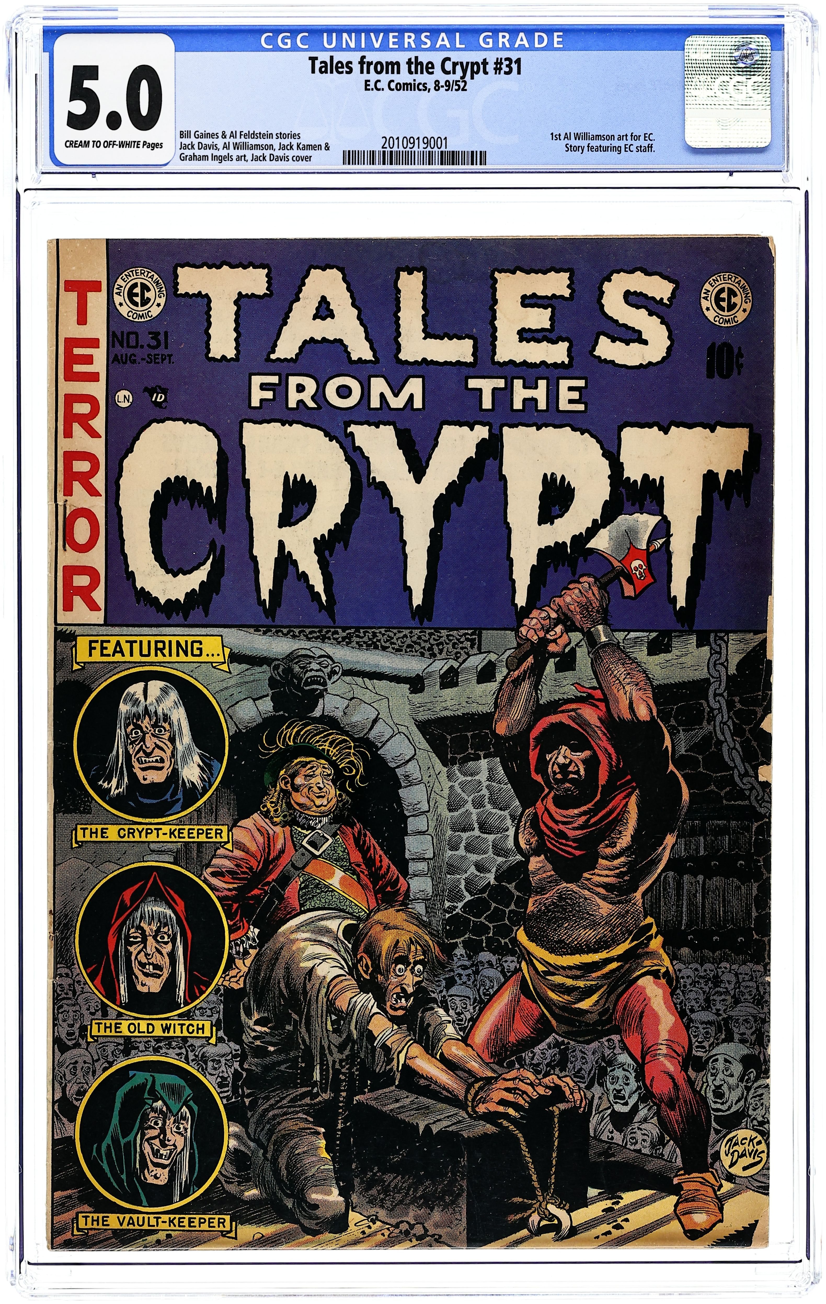 Cover by Jack Davis. EC Artist of the Month article about Jack Davis (with photo) by Al Feldstein. "Grounds...For Horror!", script by Al Feldstein, art by Jack Davis; A young boy's bullying butcher step-father locks him in the closet as punishment for various actions; At first, Artie is frightened, but meets a friend named Hozir who lives in the closet and wants to give the step-father what he deserves. "A Rottin' Trick!", script by Al Feldstein, art by Joe Orlando; A man uses a girl then dumps her and makes the mistake of seeking the help of a boat pilot to leave the country who used to love her before she killed herself. "Werewolf!" text story. "Board To Death!", script by Al Feldstein, art by Jack Kamen; A woman with a fear of enclosed spaces due to being trapped in a cave-in as a child is driven insane when her cruel husband repeatedly threatens to bury her alive. "A Sucker For a Spider!", script by Al Feldstein, art by Graham Ingels; An embezzling banker who keeps spiders for a hobby is blackmailed by his chief teller who is aware of the embezzlement. 36 pgs., full color. $0.10. Cover price $0.10.