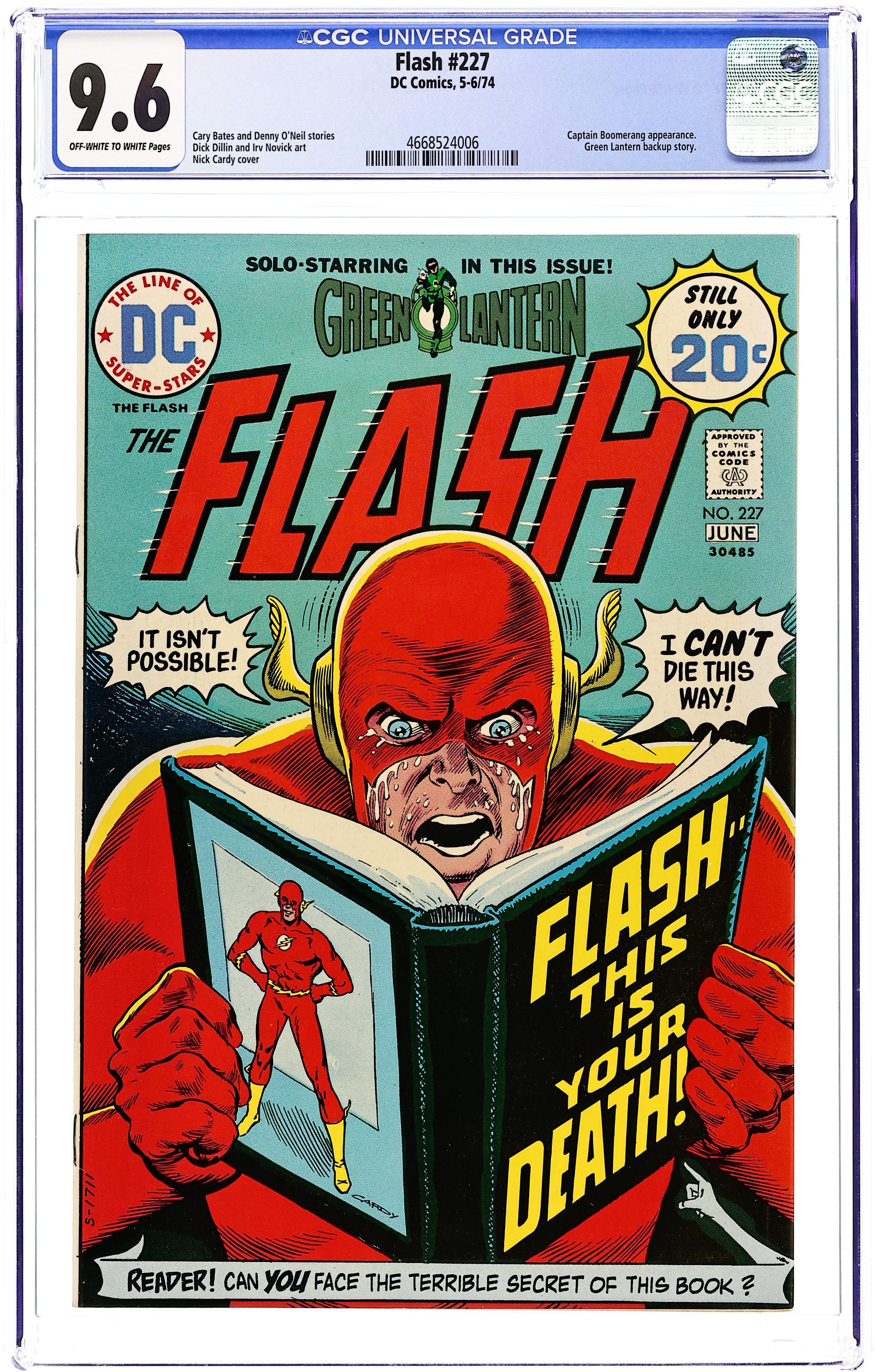Cover art by Nick Cardy. Flash -- This Is Your Death!, script by Cary Bates, pencils by Irv Novick, inks by Frank McLaughlin; Captain Boomerang's father is working on a scrap-book of Boomerang's latest run-in with the Flash; the scrapbook predicts the demise of Flash; Captain Boomerang attacks. My Ring... My Enemy!, script by Denny O'Neil, pencils by Dick Dillin, inks by Dick Giordano; Green Lantern's ring is not working correctly, causing him to do an evil act for every good act, but Green Lantern must still save people caught in a forest fire. 36 Pages, Full Color. Cover price $0.20.