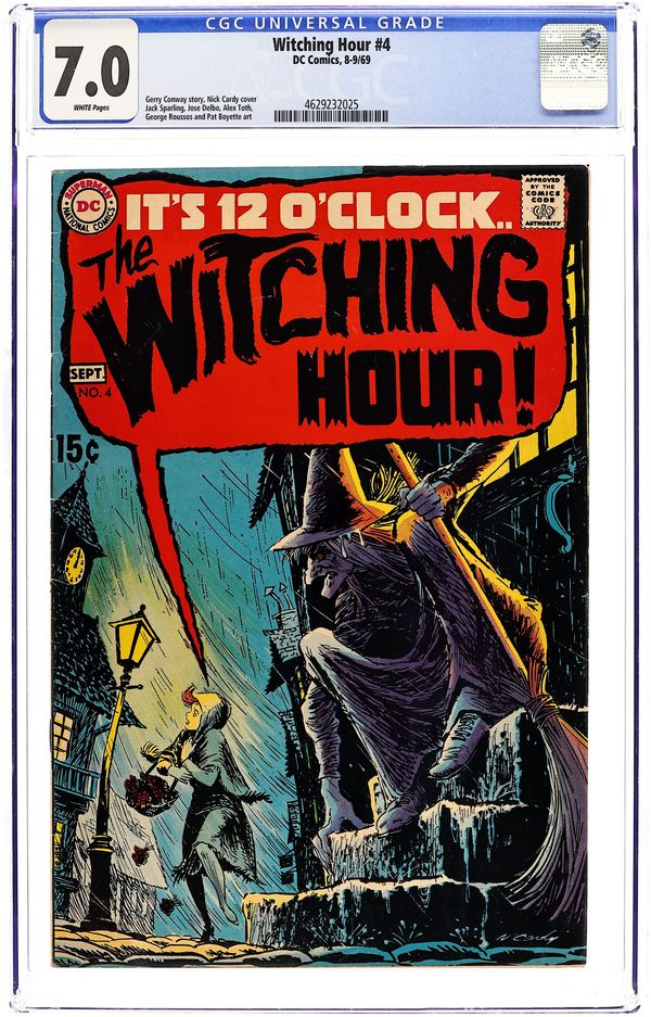 52-page giant. Featuring: 1 page The Witching Hour introductory story starring Cynthia, Mildred and Mordred, drawn by George Tuska; 9 page story "This Little Witch Went to College" written by George Kashdan and pencilled by Don Heck; 7 page reprint story "Fingers of Fear!" drawn by Carmine Infantino and Joe Giella; 7 page reprint story "The Second Life of Simon Steele" drawn by Howard Sherman; 4 page story "The Corpse Who Carried Cash!" written by Bill Dennehy and drawn by John Calnan & Vince Colletta; 8 page story "The Man in the Cellar" written by Carl Wessler and drawn by Jerry Grandenetti. Cover by Nick Cardy. 52 Pages, Full Color. Cover price $0.25.