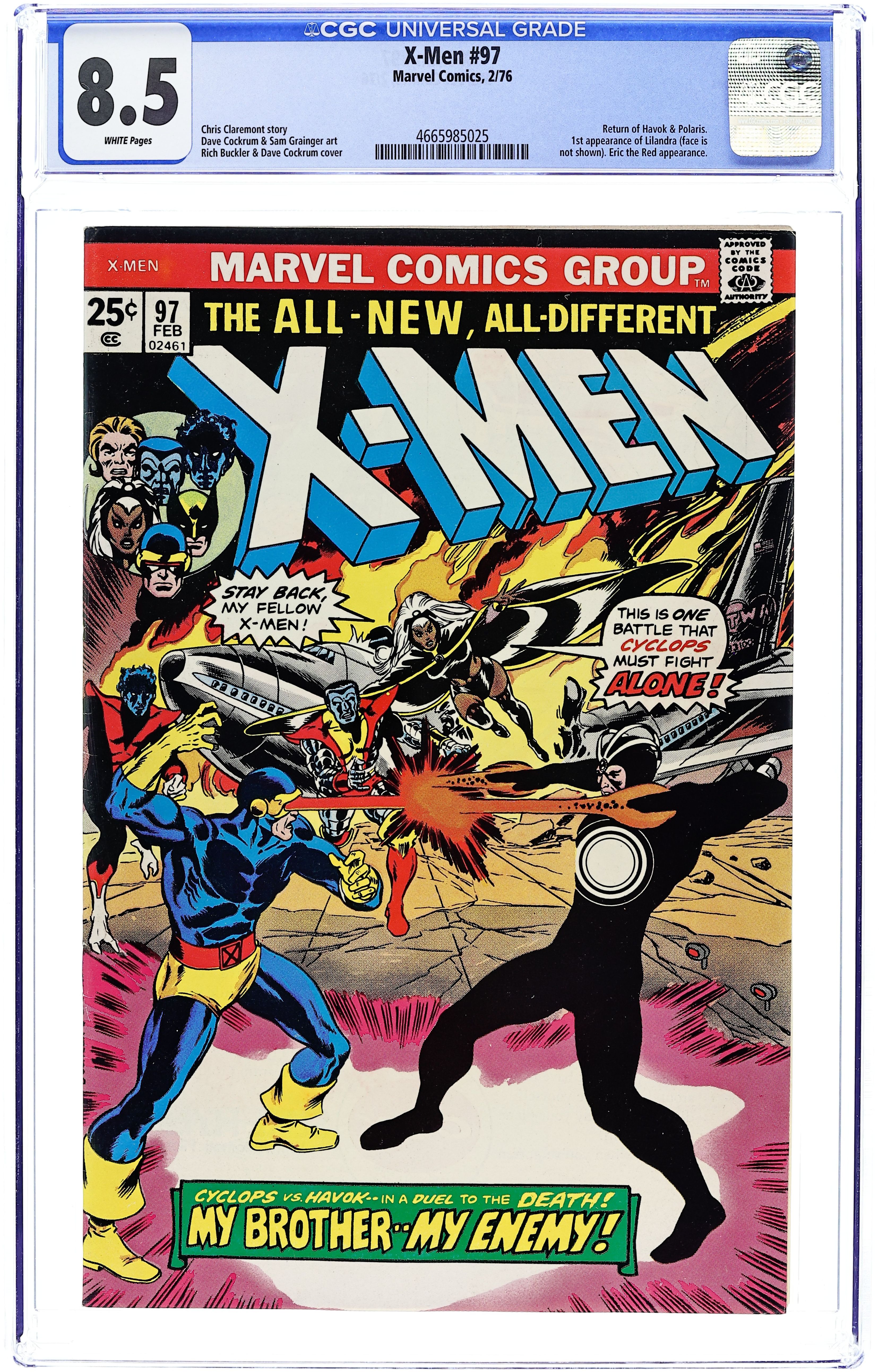 "My Brother, My Enemy!" Story by Chris Claremont. Art by Dave Cockrum and Sam Grainger. Cyclops and the all new X-Men suddenly find themselves facing off with former allies Havok and Polaris. Who is the mysterious villain that plots and schemes from the shadows? Who is this man that pits brother against brother? Plus, what do Charles Xavier's recurring prophetic nightmares mean for the future of his students? NOTE: 1st appearance of Lilandra (face & name unrevealed). Her face is seen for the 1st time in #102 and her name is revealed in #105 36 pgs. Cover price $0.25.