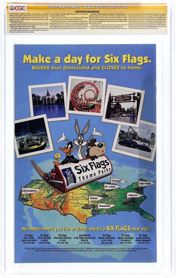 3.95-c, Embossed Gold Foil. It's Batman's first encounter with the Joker (sort of), and the Joker's cousin Melvin is also along for the ride, in "Images," a 40-page tale. Script by Dennis O'Neil, art by Bret Blevins. Plus: pin-ups by Jim Lee, Howard Chaykin, Phil Winslade, Kevin Maguire, P. Craig Russell, Ed Hannigan & John Beatty, Bob Wiacek & Walt Simonson, Sandy Plunkett, Tim Bradstreet, Brian Stelfreeze, Mark Schultz & Al Williamson, Kevin Nowlan, Michael W. Kaluta, Mike Zeck. Cover by Brian Bolland. **NOTE: This is the direct market edition with gold-embossed logo and title lettering (newstand edition is plain).** Cover price $3.95.