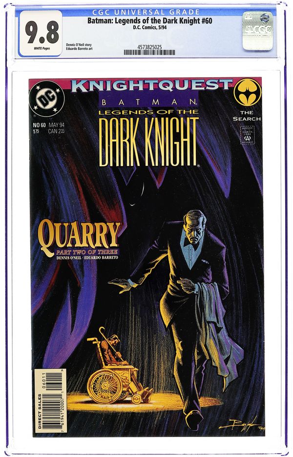 KnightQuest: The Search. Quarry, Part 2 of 3. Asp, continuing to turn Shondra Kinsolving's healing skills into a murdering weapon, threatens to kill four more heads of state unless his demands are met. Fearing that Bruce Wayne will also be one of Asp's victims, Alfred attempts to enlist the help of Batman...but the Dark Knight, consumed in his own violent agenda in Gotham City, is reluctant to come to his predecessor's aid. Written by Dennis O'Neil, with art by Eduardo Barreto. Painted cover by Norm Breyfogle. Deluxe format. Cover price $1.75.
