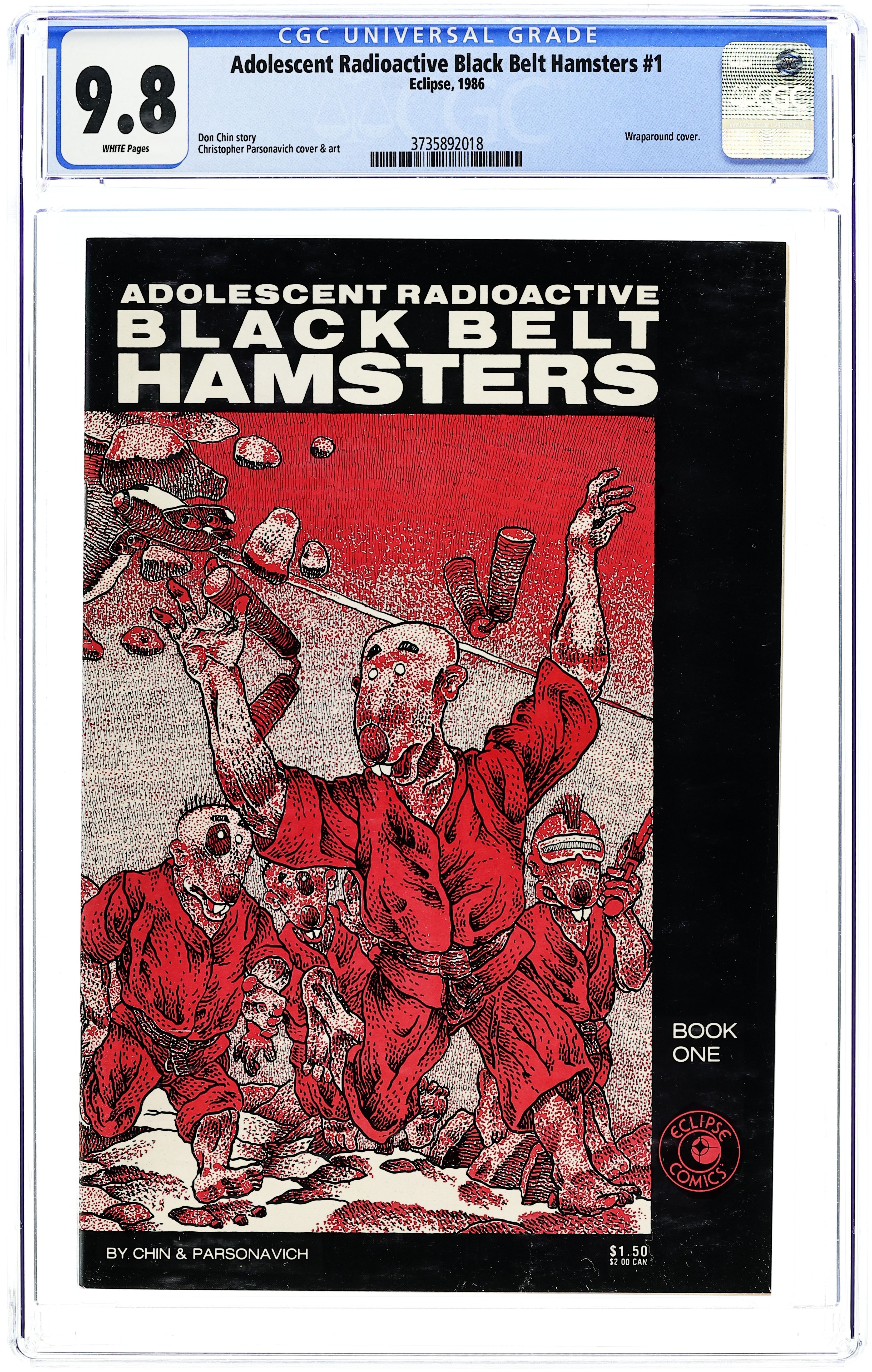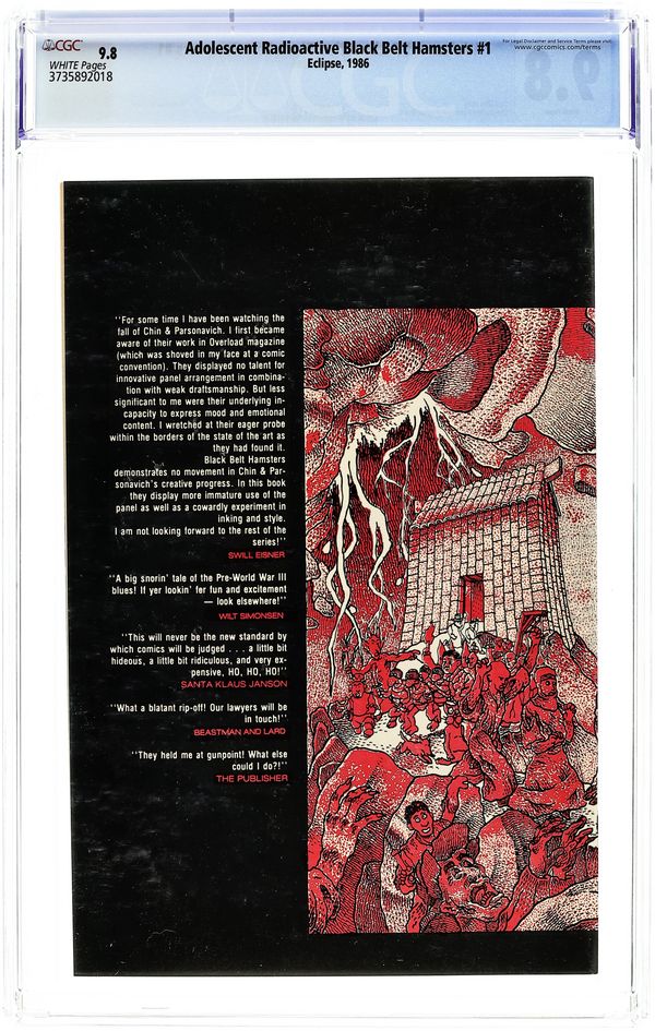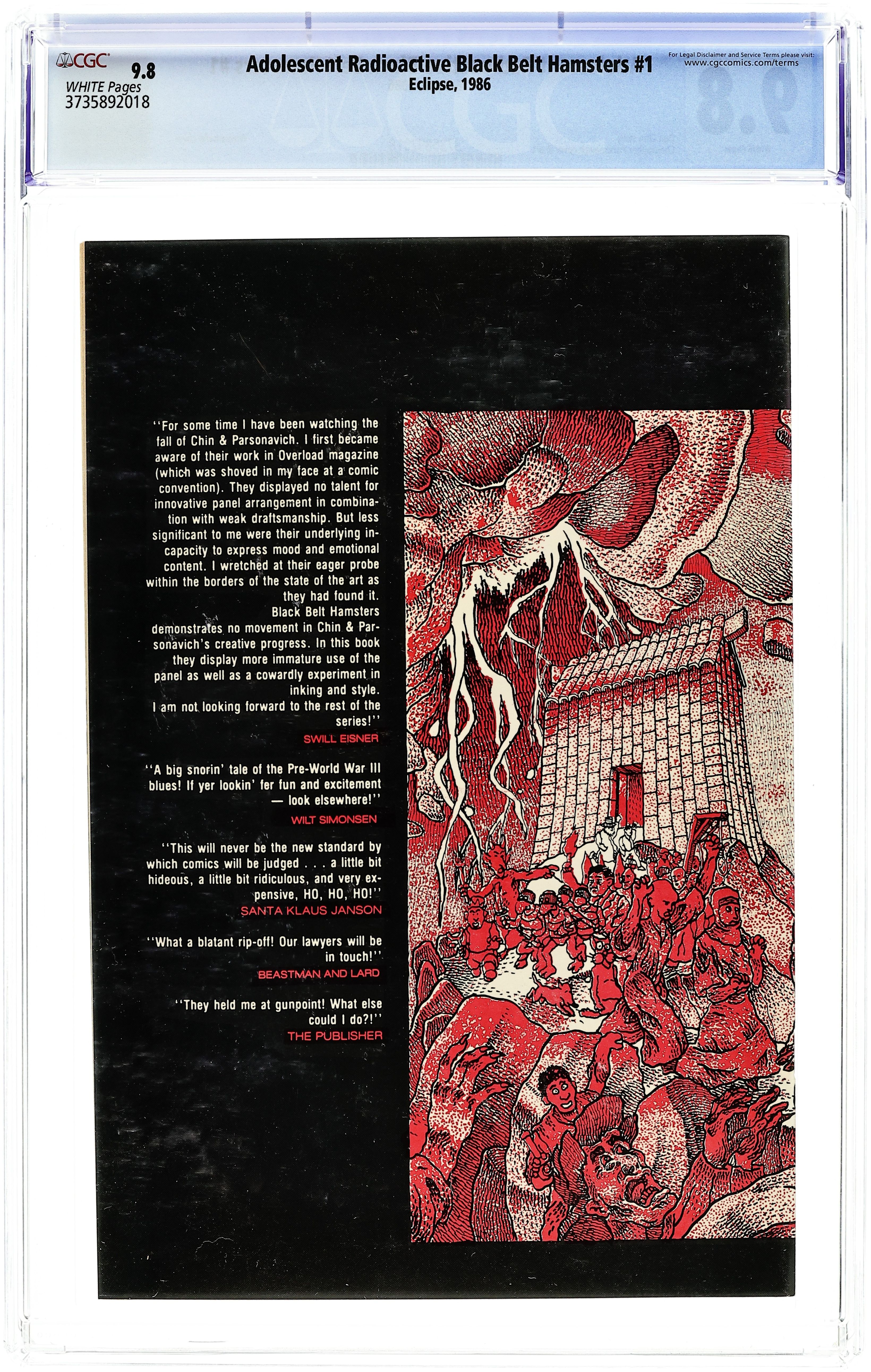 1st printing. Cover art by Christopher Parsonavich. The Adolescent Radioactive Black Belt Hamsters starring Clint, Chuck, Jackie, and Bruce, script by Don Chin, art by Christoper Parsonavich; the first unofficial spoof of the Teenage Mutant Ninja Turtles. Comic Castle has Marvelmania ad for Marvel back issues. Adolescent Radioactive Black Belt Hamsters illustration by Herb Wood; the four hamsters square off to what appears to be the shadow of Wolverine. 36 pgs. $1.50.