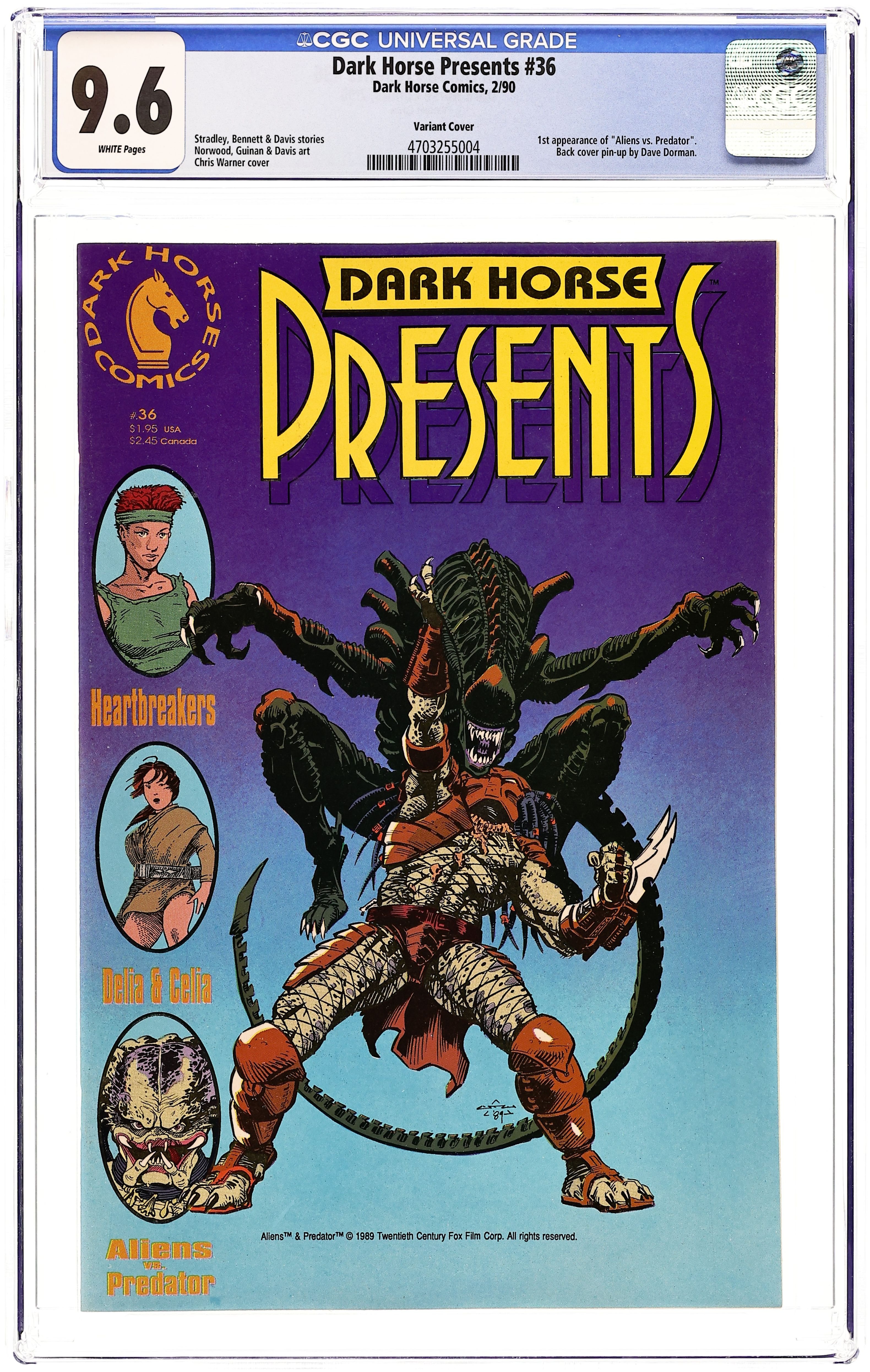 Cover by Chris Warner. The most eagerly-awaited storyline begins in this month's issue of Dark Horse Presents! They are the galaxy's most deadly alien races; now, the time has come for them to meet at last! It's the Aliens and Predator together in one story! The confrontation of the century brought to you by Randy Stradley and film designer (The Abyss and Robocop II) Phillip Norwood! The story will then continue in a full-color miniseries coming out next month! Also, Paul Guinan and Anina Bennet continue the story of The Heartbreakers--beautiful and deadly clones! Plus, the further "sword and sorcery" adventures of Delia and Celia by Gary Davis! 32 pages, B&W. Cover price $1.95.