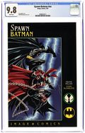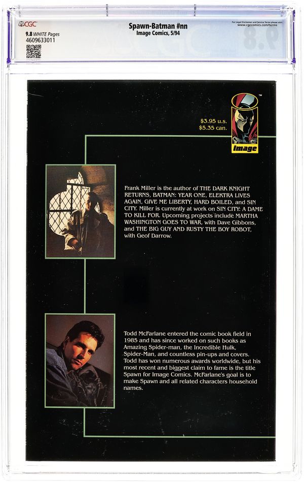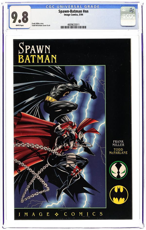 Dynamic Forces Signed Edition. Signed by writer Frank Miller, limited to 10,000 copies. Includes Dynamic Forces Certificate of Authenticity. Cover pencils by Todd McFarlane, inks by Kiko Taganashi. Prestige format one-shot pitting Bob Kane's classic creation Batman against Todd McFarlane's Spawn (a product of Image Comics). It is a companion piece to Frank Miller's The Dark Knight Returns. Untitled story, script by Frank Miller, art by Todd McFarlane; Batman travels to New York City where he is duped by a twisted humanitarian into battling Spawn. Spawn illustration by Greg Capullo. Batman/Spawn illustration by Todd McFarlane and Frank Miller. Dedication of the book to Jack Kirby, includes photograph of Kirby. Short biographical paragraphs and photographs on Frank Miller and Todd McFarlane on the back cover. 60 pgs., full color. Cover price $3.95.