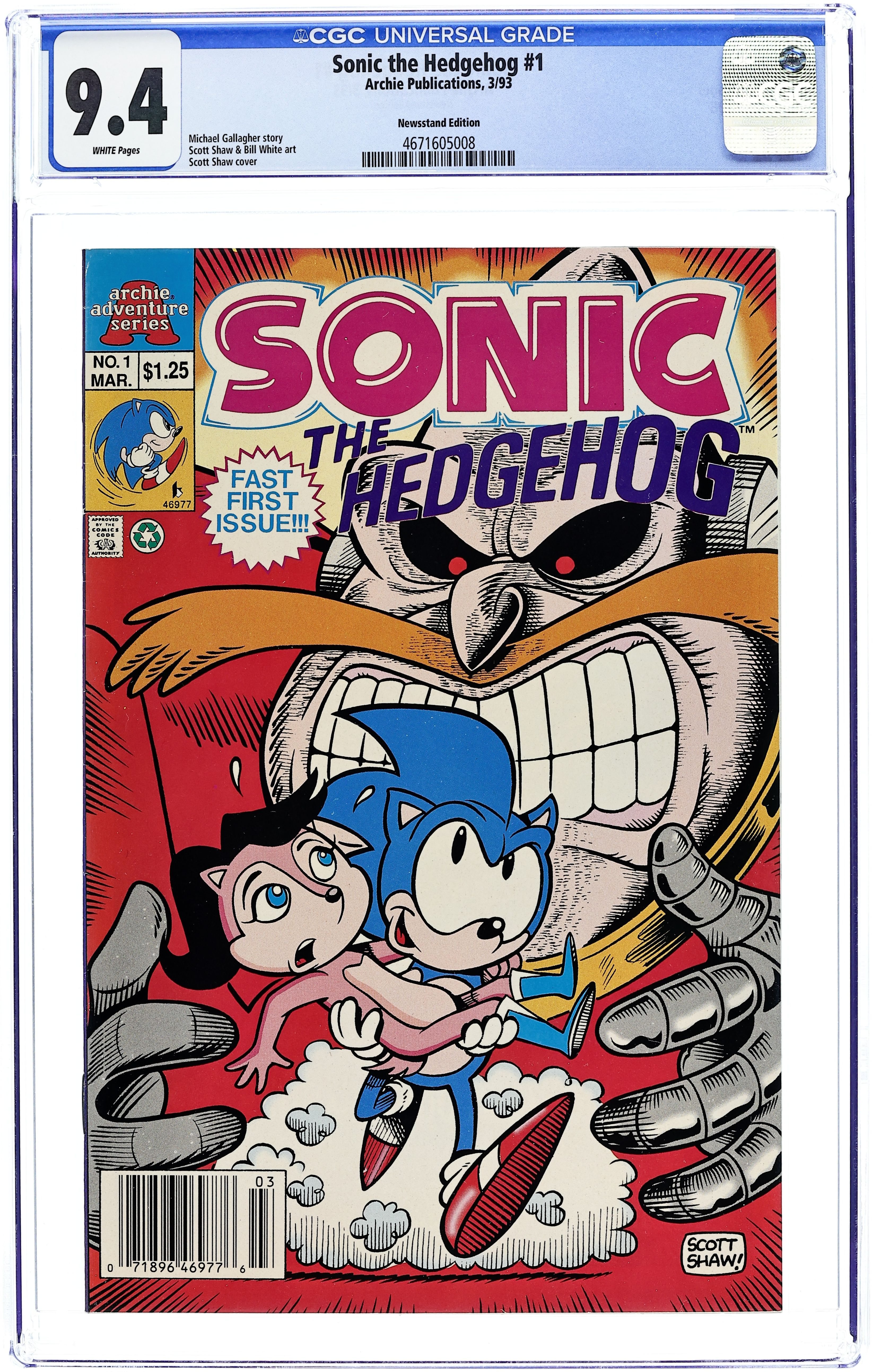 Newsstand Edition. Based on the Sega video game. Cover by Scott Shaw. "Run, Sally, Run," script by Michael Gallagher, pencils by Scott Shaw, inks by Bill White; Sally plans to meet Robotnik at a neutral site to negotiate the release of her father; But Sonic and the gang fear it's a trap. "Something Fishy," script by Michael Gallagher, pencils by Scott Shaw, inks by Bill White; Sonic goes underwater after a mechanical fish destroying everything in sight. 36 pgs., full color. $1.25. Cover price $1.25.