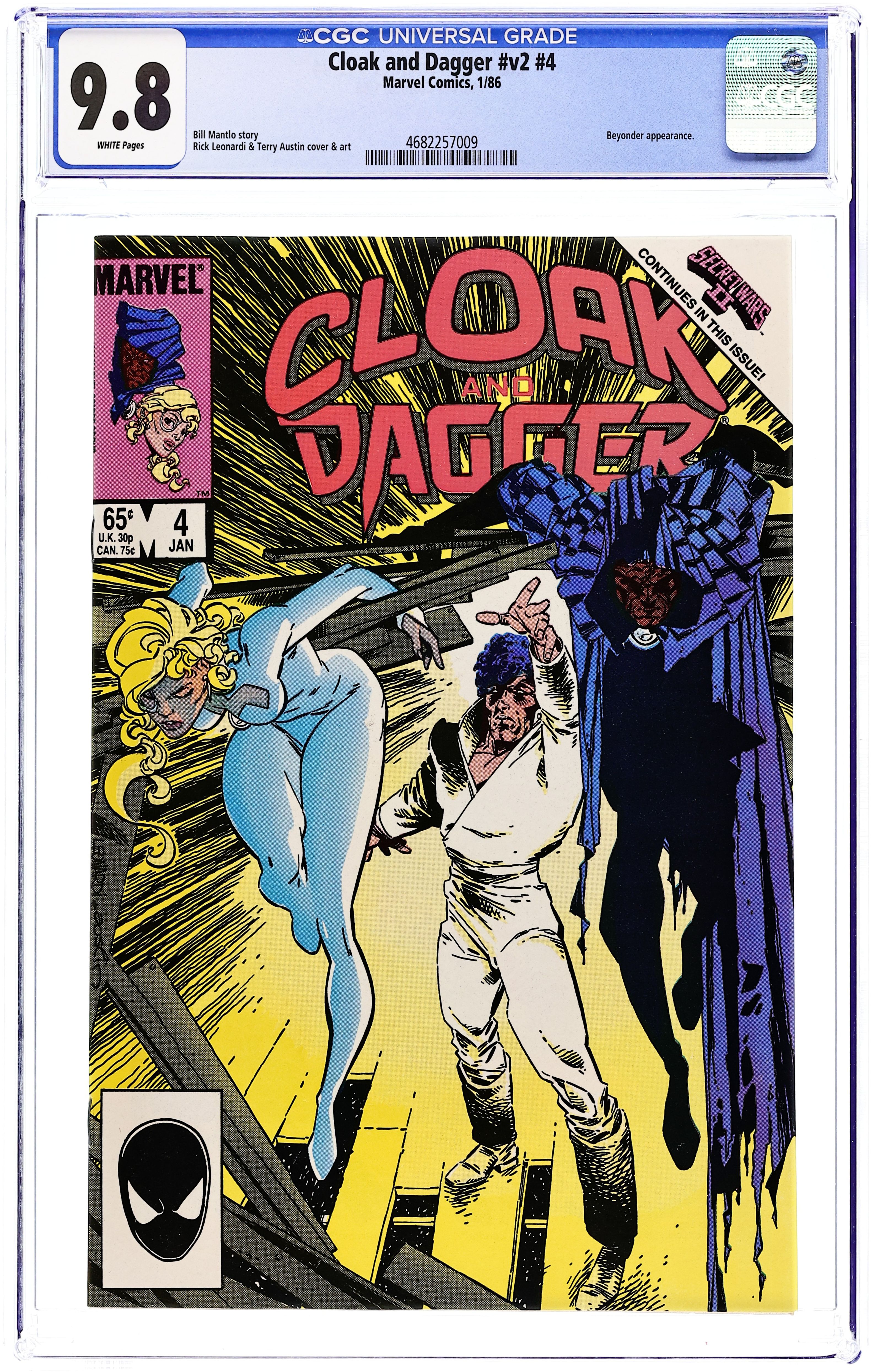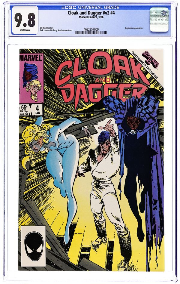 Secret Wars II tie-in. Last 65-cent cover price. Cover pencils by Rick Leonardi, inks by Terry Austin. Ultimatums, script by Bill Mantlo, pencils by Rick Leonardi, inks by Terry Austin; The Beyonder enters the lives of Cloak and Dagger. 36 pgs. $0.65. Cover price $0.65.