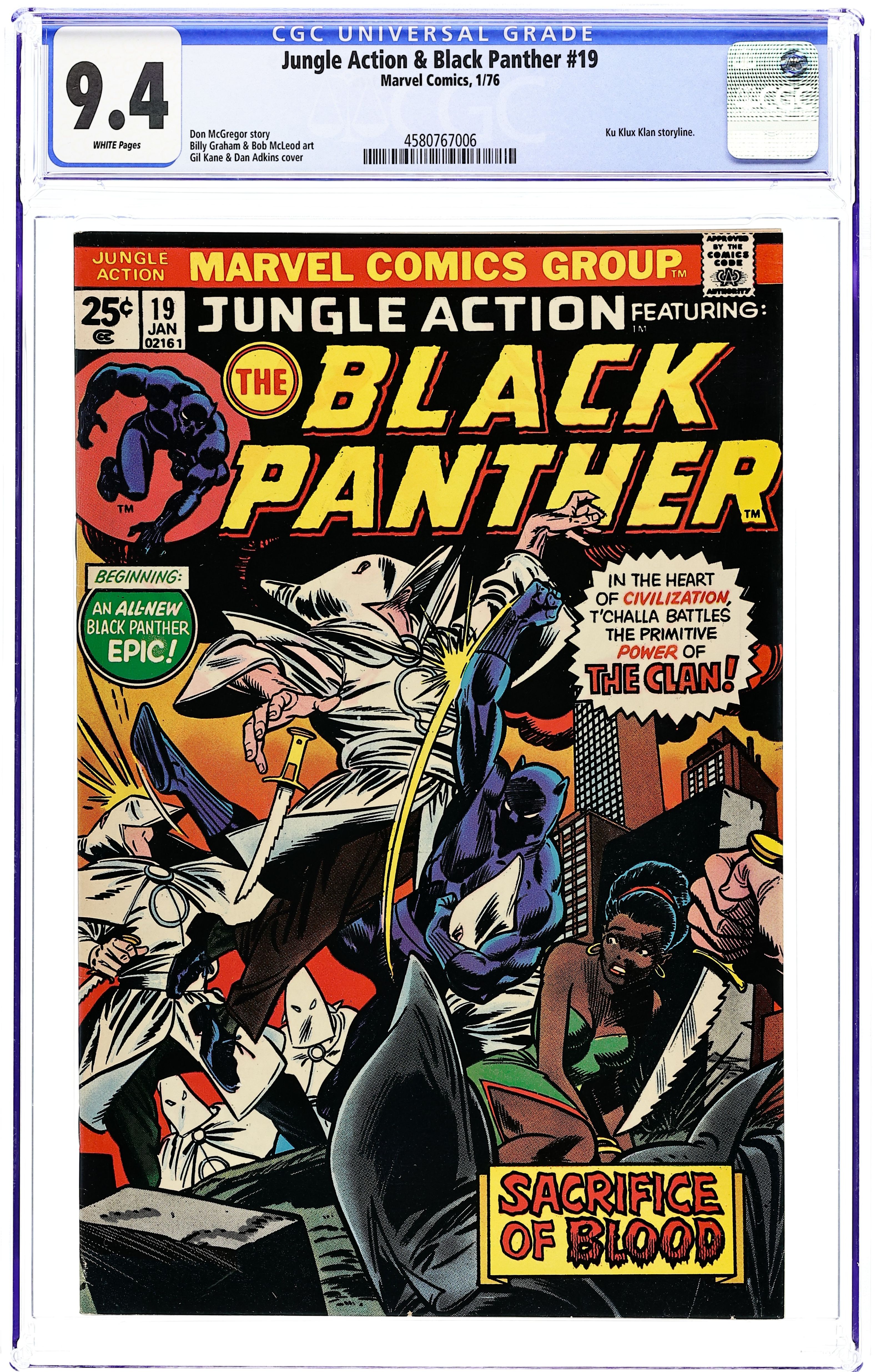 Cover pencils by Gil Kane, inks by Dan Adkins. The Black Panther stars in the Panther versus the Klan part 1, "Blood and Sacrifices, script by Don McGregor, pencils by Billy Graham, inks by Bob McLeod; The Panther and Monica visit her parents in Georgia; They are attacked by the Dragon's Circle and the Ku Klux Klan. Letters from comics writers Stan Timmons and Bruce Canwell. 36 pgs., full color. Cover price $0.25.