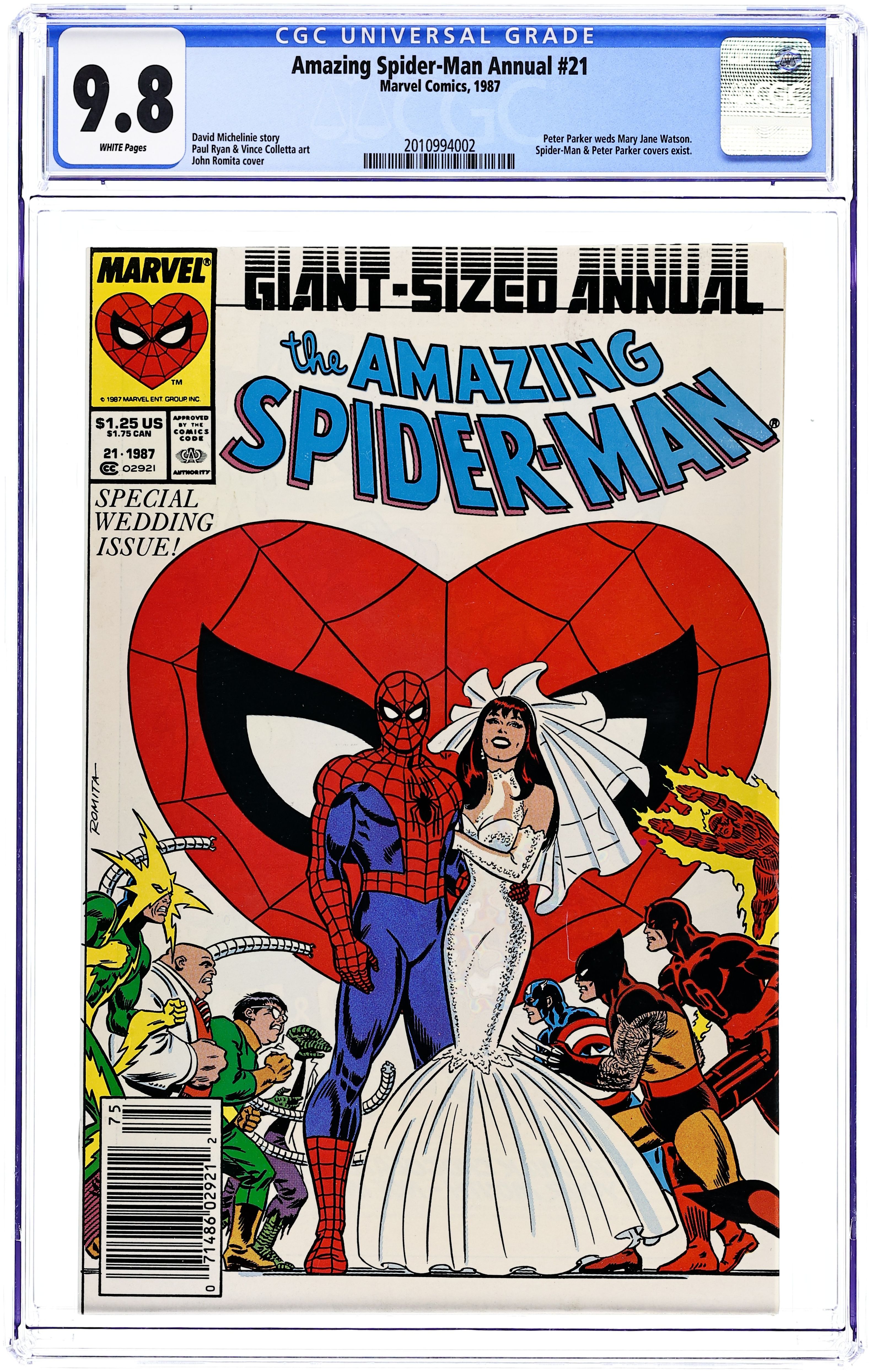 Newsstand Edition. The marriage of Peter Parker and Mary Jane Watson in "The Wedding." Plot by Jim Shooter. Script by David Michelinie. Pencils by Paul Ryan. Inks by Vince Colletta. Cover by John Romita Sr. Newsstand Edition. At long last wedding bells ring for Peter Parker and Mary Jane Watson! What an exciting day! The blushing bride will need something old, something new, something borrowed, and something blue! While the Amazing Spider-Man will need to take care of two things before the big day! First, the easy task...short circuit Electro's latest scheme! And second, the tough one...put the memory and heartache of Gwen Stacy in the past forever. Will another trip to the Brooklyn Bridge bring peace to the wondrous wall-crawler? Or will the ghosts of days gone by derail a bright future with Mary Jane? Carpe diem, web-slinger! Appearances by Flash Thompson, Harry Osborn, Liz Osborn, Betty Leeds, Aunt May, Anna Watson, Joe Robertson, J. Jonah Jameson, and Willi Smith. Flashback cameos by the Green Goblin, Gwen Stacy, and Uncle Ben. (Notes: Peter and Mary Jane go on their honeymoon in Spectacular Spider-Man Annual 7. The Direct Edition cover features Peter Parker's friends and family. The Newsstand Edition depicts Spider-Man's friends and foes. Amazing Spider-Man Annual 21 was one of the first issues Marvel published with two different covers. This story was reprinted in the 1991 trade paperback: the Amazing Spider-Man - The Wedding.) 52 pages. Cover price $1.25.