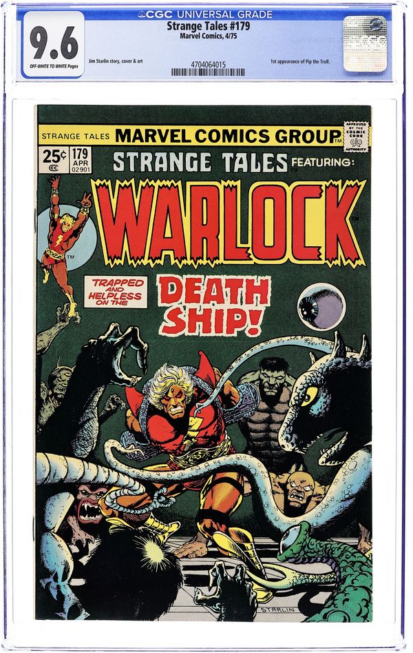 Cover art by Jim Starlin. "Death Ship!", script and art by Jim Starlin; Warlock is captured by Autolycus of the Black Knights an brought aboard Magus' Flagship; His fellow prisoners tell Warlock, that survivors of the Wars of the Church are taken as slave laborers, those who refuse will be terminated and their remains will be chemically broken down and valuable elements that can be retrieved will be used to further the cause of the Church; They also tell him, that Non-Humanoids are not considered fashioned in the Magus' image and thus must be disposed of, this also holds true for some Humanoid types—such as Trolls; First appearance of Pip the Troll. 36 pgs., full color. Cover price $0.25.
