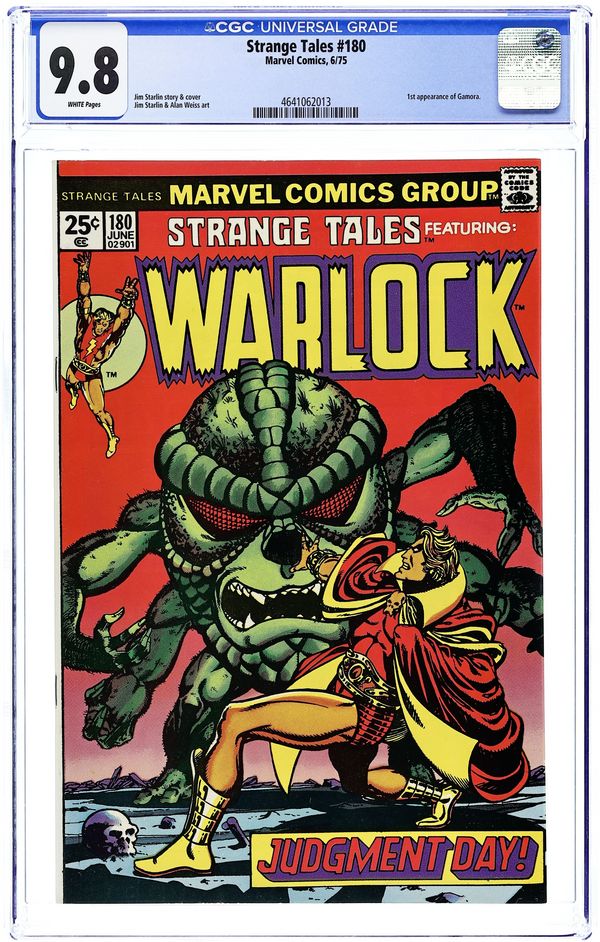 Cover art by Jim Starlin. "The Judgment!", script by Jim Starlin (as Sam Jiltirn), pencils by Jim Starlin, inks by Jim Starlin (as J.L. Minirats) and Alan Weiss; While battling a couple of the Black Knights the Soul Gem almost takes control again and Warlock decides, that he must destroy it, however as he takes it off Warlock collapses and realizes, that he can no longer exist without the Gem as it has been sucking out Warlock's Soul in the last three Years thus becoming his life force; The Matriarch wants to make a Slave out of Warlock now instead of killing him; After trying to remove the Gem Warlock is invited by the Matriarch to the Sacred Palace, an obvious trap, but since she claims, that she knew that the gem would become a danger even to Warlock himself, Warlock decides to accept the invitation and ditches; Pip First appearance of Gamora. Spider-Man stars in a one-page Hostess ad, "The Trap." 36 pgs., full color. Cover price $0.25.