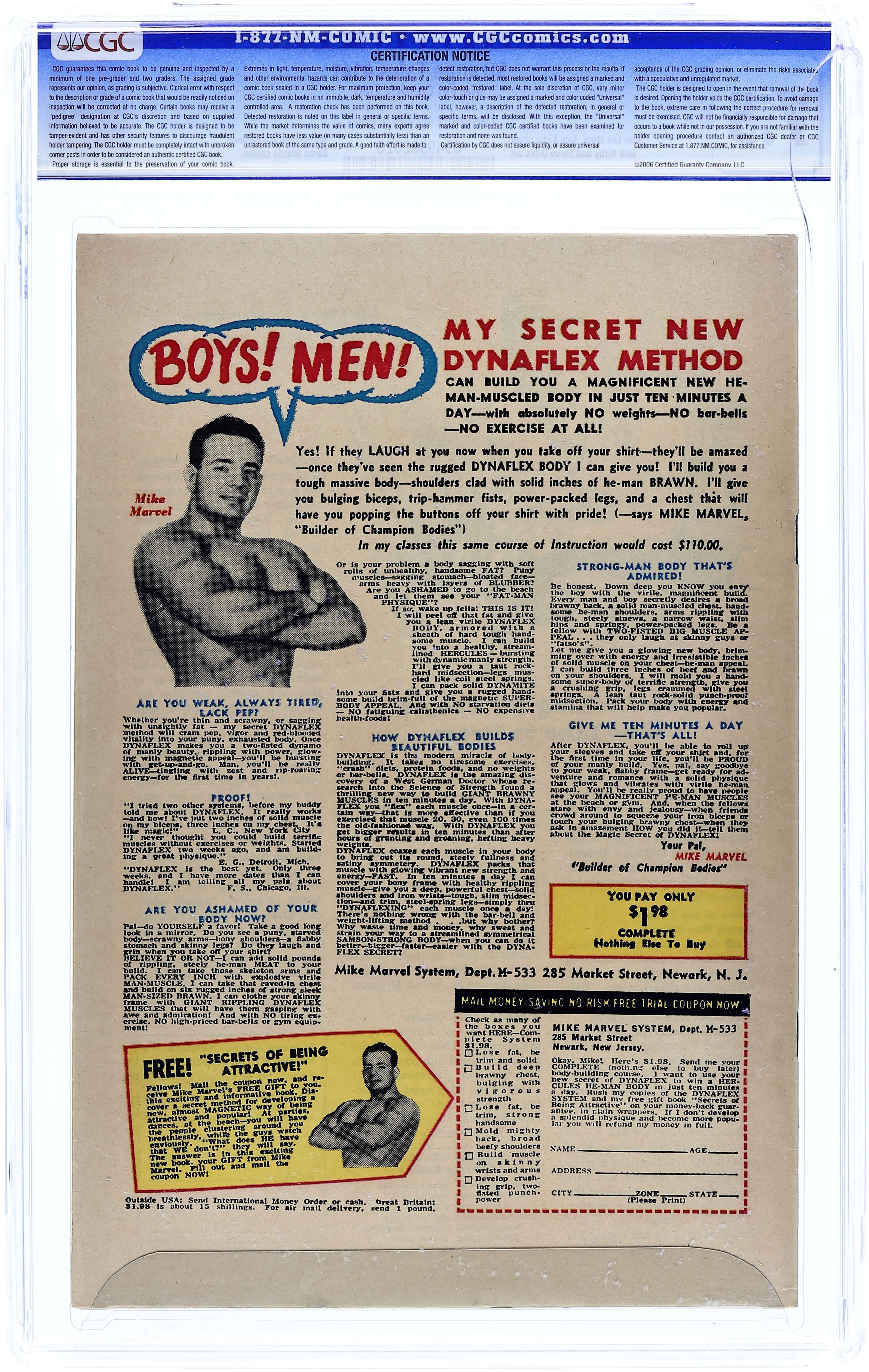 Cover art by Bill Everett. "The Things in the Coffins," art by Joe Sinnott; A drifter takes a job as cemetery caretaker, but when he notices that none of the tombstones have names, he digs one up only to uncover a buried invasion force from Pluto. "A Man of Decision" text story. "Mission to Mars!", art by Ed Goldfarb; In 2253 a diplomatic mission is sent to Mars to trade for food as Earth has been ravaged by atomic war; All of the men take their mission very seriously, except the young pilot who is kind of a class clown; He has a doll which resembles the captain and he makes it do a silly dance but the other men find no humor in his antics. "Russia!", script by Carl Wessler, art by Sam Kweskin; As Anastatia Romanov lies dying, she remembers the events of the Russian revolution and the execution of her family, along with the curse of Rasputin that if harm were to come to him Russia would be ruined. "Come In!", art by Vic Carrabotta; A young man about to enlist visits a fortune teller as he wishes to know if he will be killed in war; The fortune teller gazes into her crystal ball and tells him no, and he is relived until she hands his money back. "The Fat Man," art by Bob Fujitani; The ship's cook and two sailors are stuck on a life raft that reaches an island; The native chief lets the two skinny sailors go, but puts the obese cook in a caldron, as he is quite fat from eating food he hoarded from his comrades. 36 pgs., full color. Cover price $0.10.