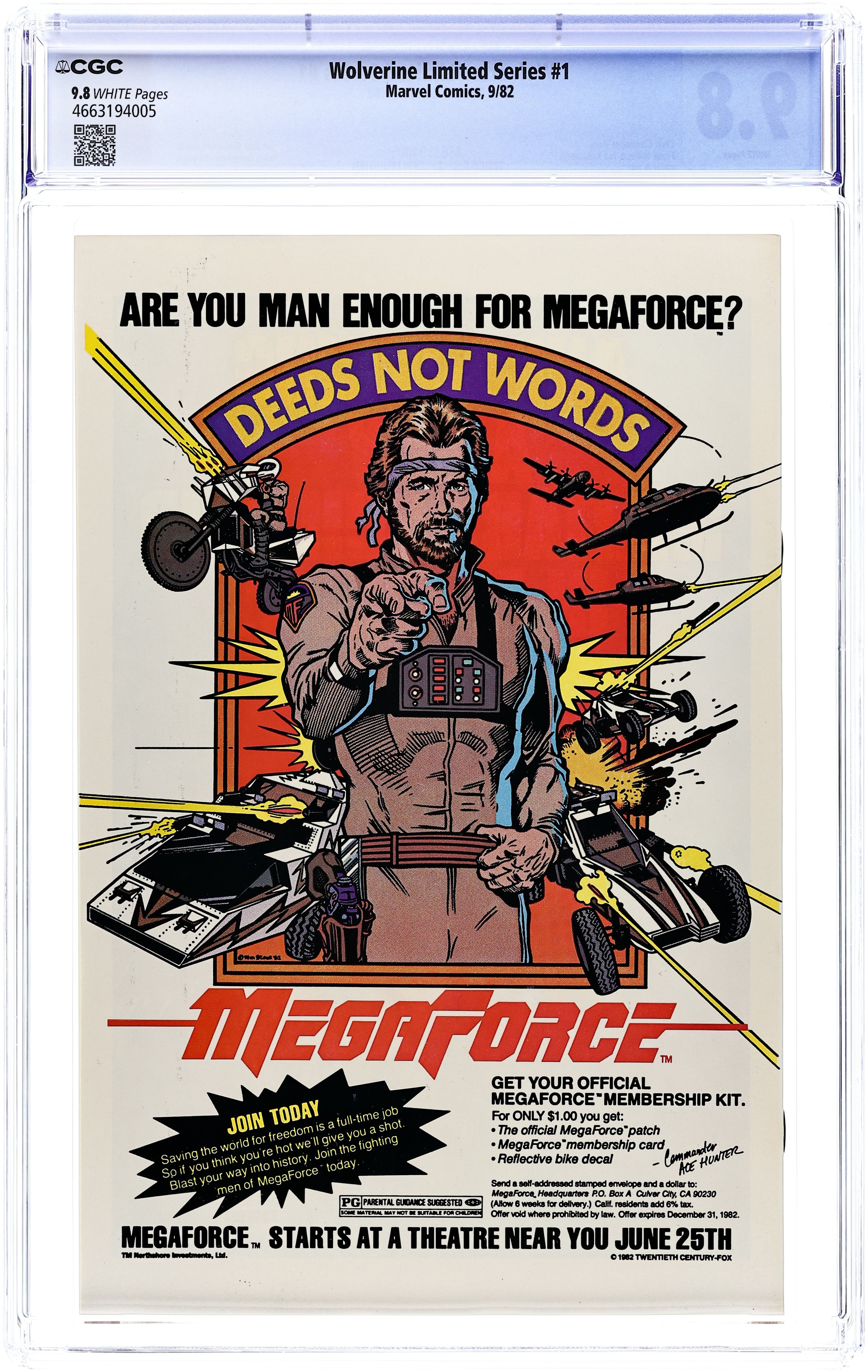 Direct Edition. 1 of 4 Featuring Wolverine in his first solo series fighting in Japan. "Wolverine." Script by Chris Claremont, pencils by Frank Miller, inks by Joe Rubinstein. Miller/Rubinstein cover. Back cover MegaForce ad with art by William Stout. Cover price $0.60.