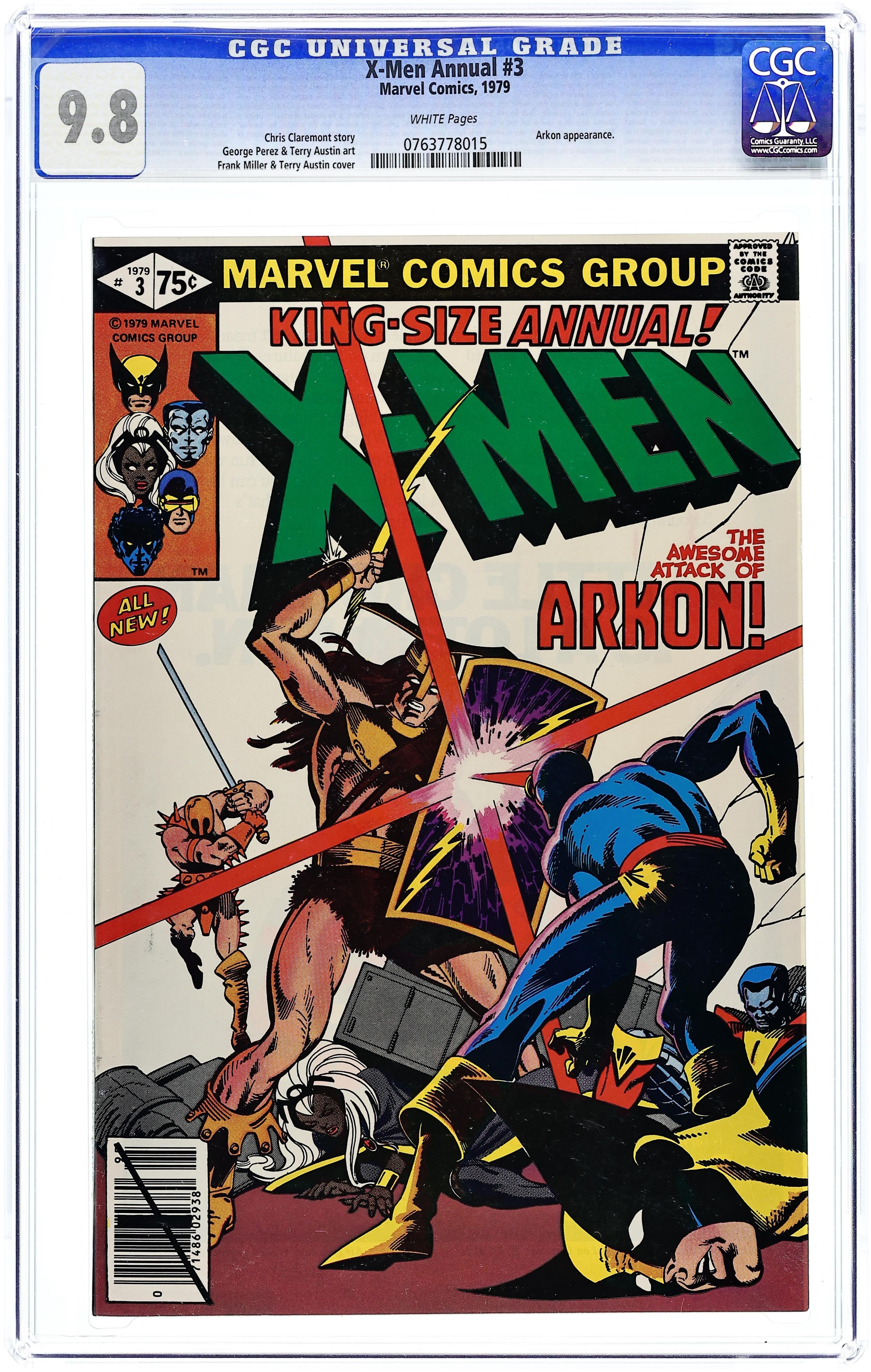 Direct Edition. A Fire in the Sky! - Written by Chris Claremont. Art by George Pérez and Terry Austin. Cover by Frank Miller and Terry Austin. The X-Men battle Arkon and are transported to his world where they are asked to help save it. Story takes place between Uncanny X-Men (1963 1st Series) #124 and 125. Characters in this issue: X-Men [Cyclops; Storm; Wolverine; Colossus; Nightcrawler; Banshee]; Edwin Jarvis; VILLAINS: Arkon; Imperions; CAMEO FLASHBACK: Captain America [Steve Rogers]; Thor; Iron Man [Tony Stark]. 52 pages, full color. Cover price $0.75.