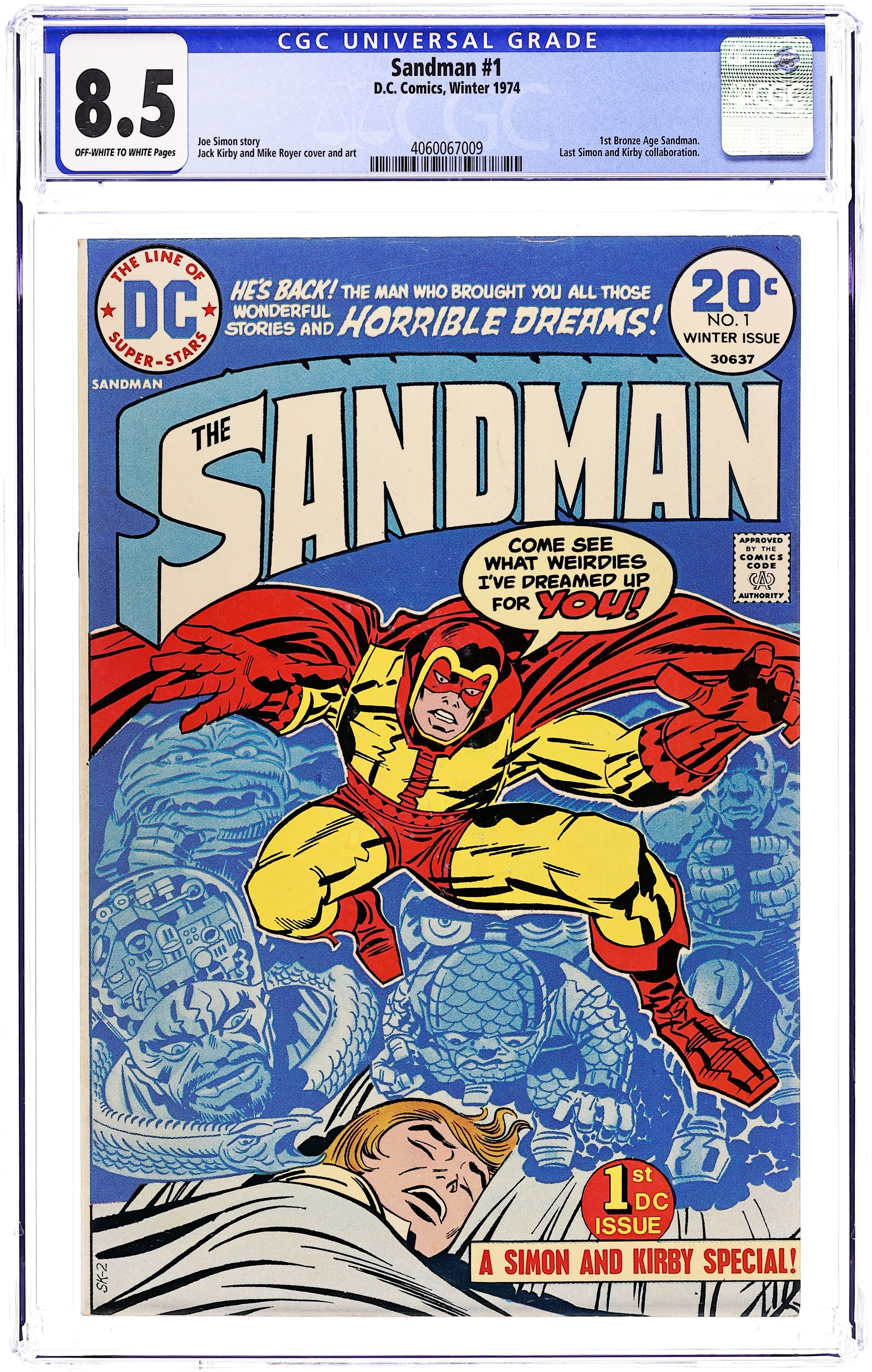 1st Bronze Age Sandman. Last Simon & Kirby collaboration. Cover by Jack Kirby and Frank Giacoia. General Electric, script by Joe Simon, art by Jack Kirby and Mike Royer; When a boy named Jed Walker has a strange dream of a drowning man who appears in reality to give him an evil little doll, it spurs the Sandman to emerge from the Dream Stream into the real world to stop the plans of General Electric. Article on memory and dreams by Alan Asherman. 36 pgs., full color. $0.20. Cover price $0.20.