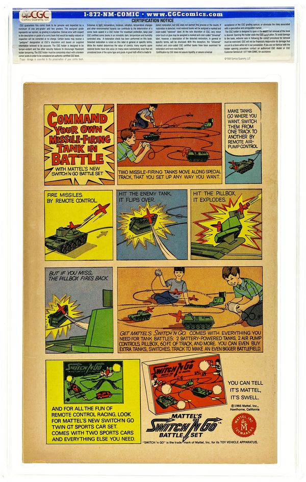 Cover art by Joe Kubert. Death Takes No Holiday! Starring Enemy Ace, script by Robert Kanigher, pencils by Neal Adams, inks by Joe Kubert; Enemy Ace faces pilots attired like skeletons. Ad for DC Special #3 and The Flash #187, pencils by Neal Adams and Ross Andru, inks by Nick Cardy and Mike Esposito. Air Force Heroes and The Mechanic humor half-page pages by John Costanza. Ad for The Brave and the Bold #83, art by Irv Novick. 36 Pages, Full Color. Cover price $0.12.