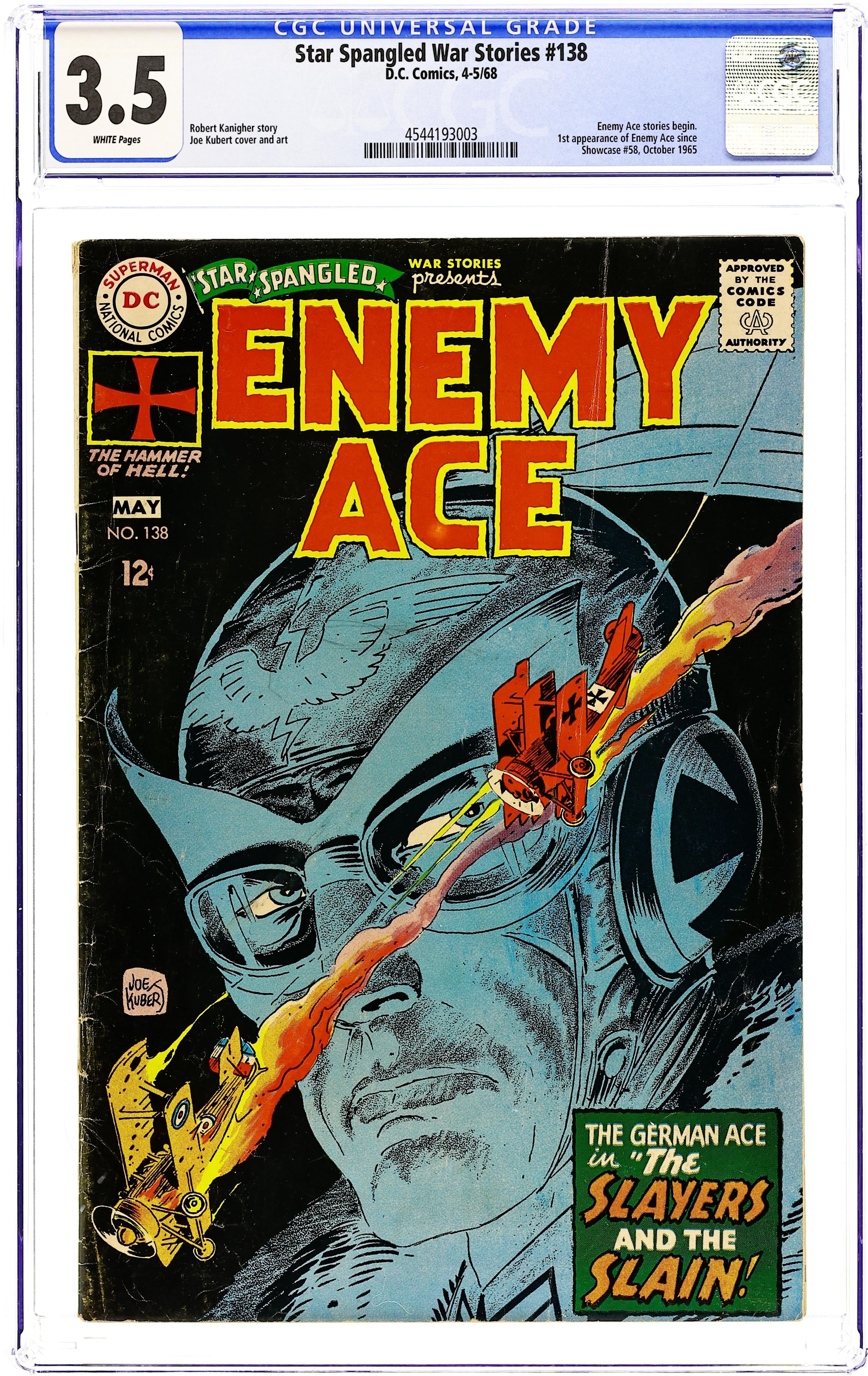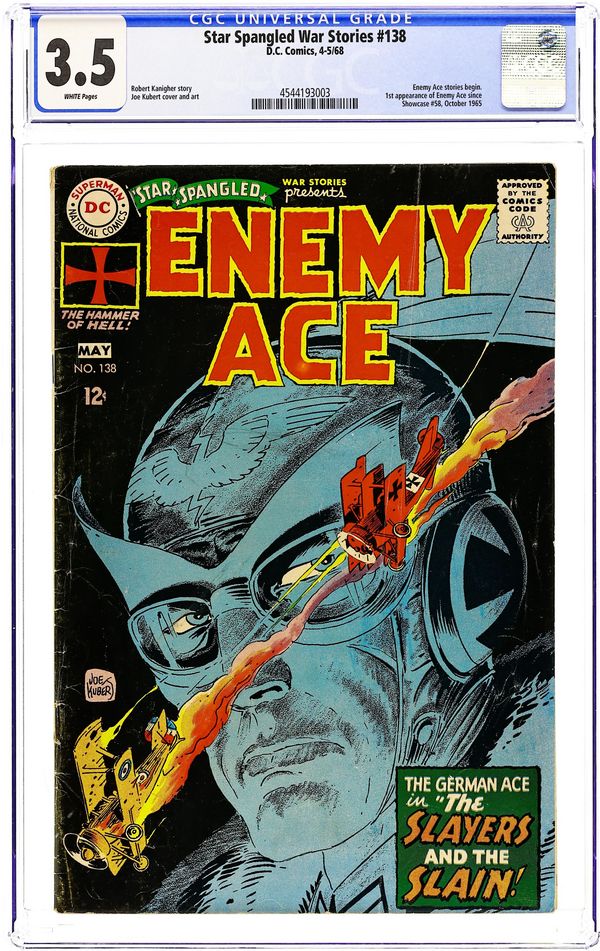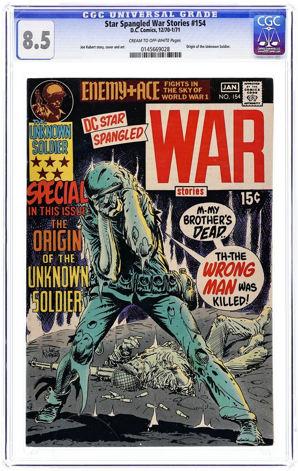 Cover art by Joe Kubert. I'll Never Die starring Unknown Soldier, script and art by Joe Kubert; origin of Unknown Soldier. Killer Of The Skies! starring Enemy Ace, script by Robert Kanigher, art by Joe Kubert; The Enemy Ace faces off agains The Hunter, a Canadian Ace, over No-Man's Land. 36 Pages, Full Color. Cover price $0.15.