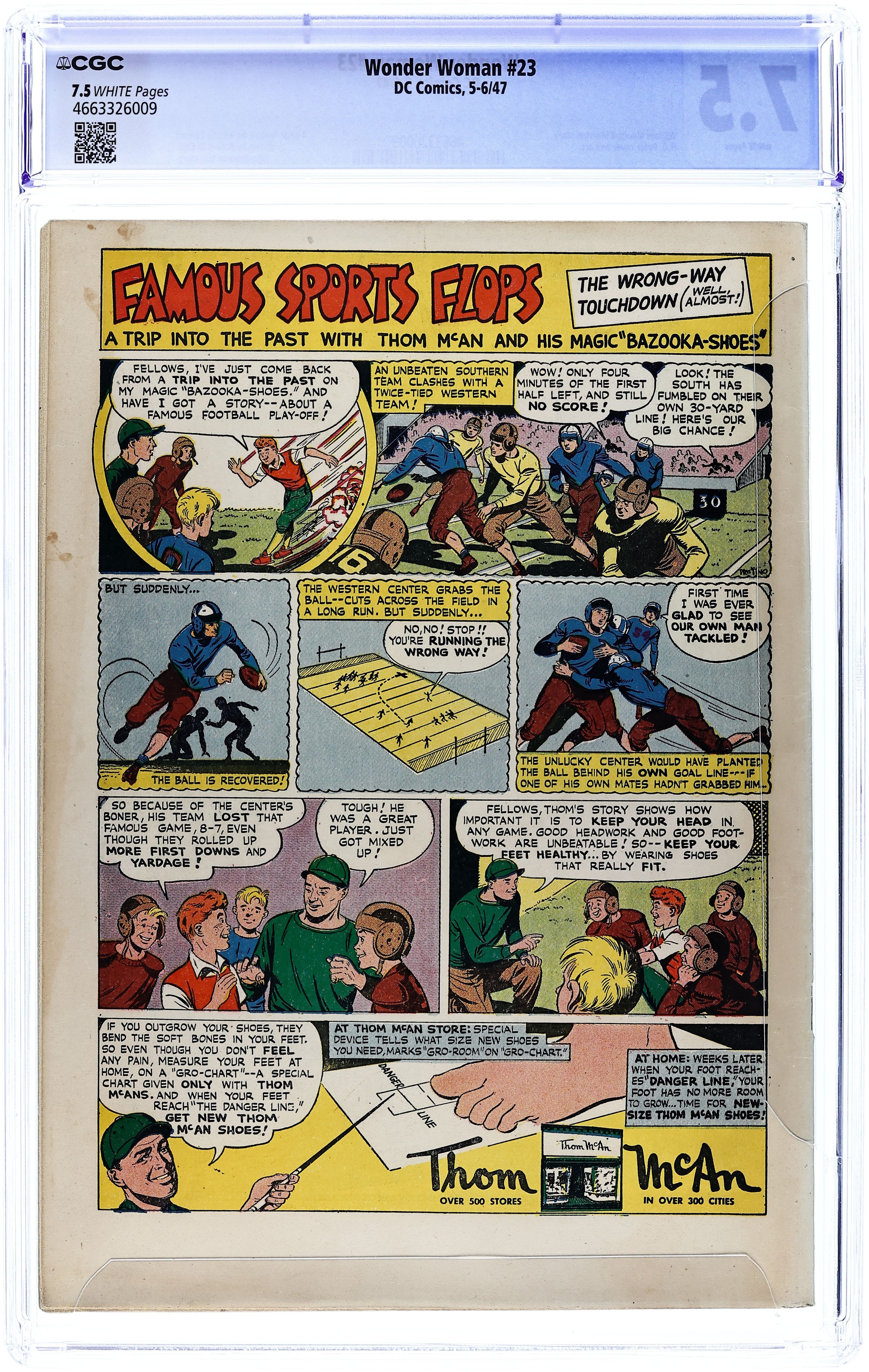 Cover by Harry G. Peter. "The Adventure of the Life Vitamin," script by William Moulton Marston (as Charles Moulton), art by Harry G. Peter; While visiting Paradise Island, Wonder Woman is shown the future through the Magic Sphere, in which the Amazon Princess and Etta discovering a vitamin that will extend human life and can restore youth. "America's Wonder Women of Tomorrow!", script by William Moulton Marston (as Charles Moulton), art by Harry G. Peter; As Wonder Woman continues to view the future in the Magic Sphere, she sees Steve nominated for President in the year 3004. Realizing that Steve has been elected unfairly, as Diana Prince Wonder Woman is elected President. Women of History: four-page Joan of Arc bio, script by Alice Marble, pencils by Paul Reinman, inks by Sam Burlockoff. Join The Junior Justice Society of America ad. "The Secret Weapon," script by William Moulton Marston (as Charles Moulton), art by Harry G. Peter; Primal Island is overthrown in the year 3700 by Moteeva and Wonder Woman is captured by Moteeva's troops. "Davidura" text story by Hop Harrigan. "Demon of the Depths," by William Moulton Marston (as Charles Moulton), art by Harry G. Peter; Paula's daughter Gerta is a strong willed child, and will have a bad future unless Wonder Woman and Paula can make her more submissive to authority. Tootsie Roll back cover ad, "Captain Tootsie and the Great Jewel Robbery" by Rod Reed and C.C. Beck. 60 Pages, Full Color. Cover price $0.10.
