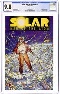 Double-size issue in which a youngster named Geoffry goes off with a stranger and when he returns, he suddenly has extraordinary abilities and is the geomancer for the Eternal Warrior and his abilities lead him to Solar who he believes is "The Man Who Killed the World." Guest starring the Eternal Warrior and the Geomancer. Script by Jim Shooter and art by D. David Perlin & Stan Drake & John Dixon & Paul Autio. Issue also has the conclusion of "Alpha and Omega," a 10-part origin story of Solar Man of the Atom with script by Jim Shooter and art by Barry Windsor-Smith and Bob Layton. Each chapter of the origin story has a two-page pinup. When all 10 two-page pinups are put together, they form a gigantic page of the climax of the origin story. 1st printing. Giant-size issue. Cover price $3.95.