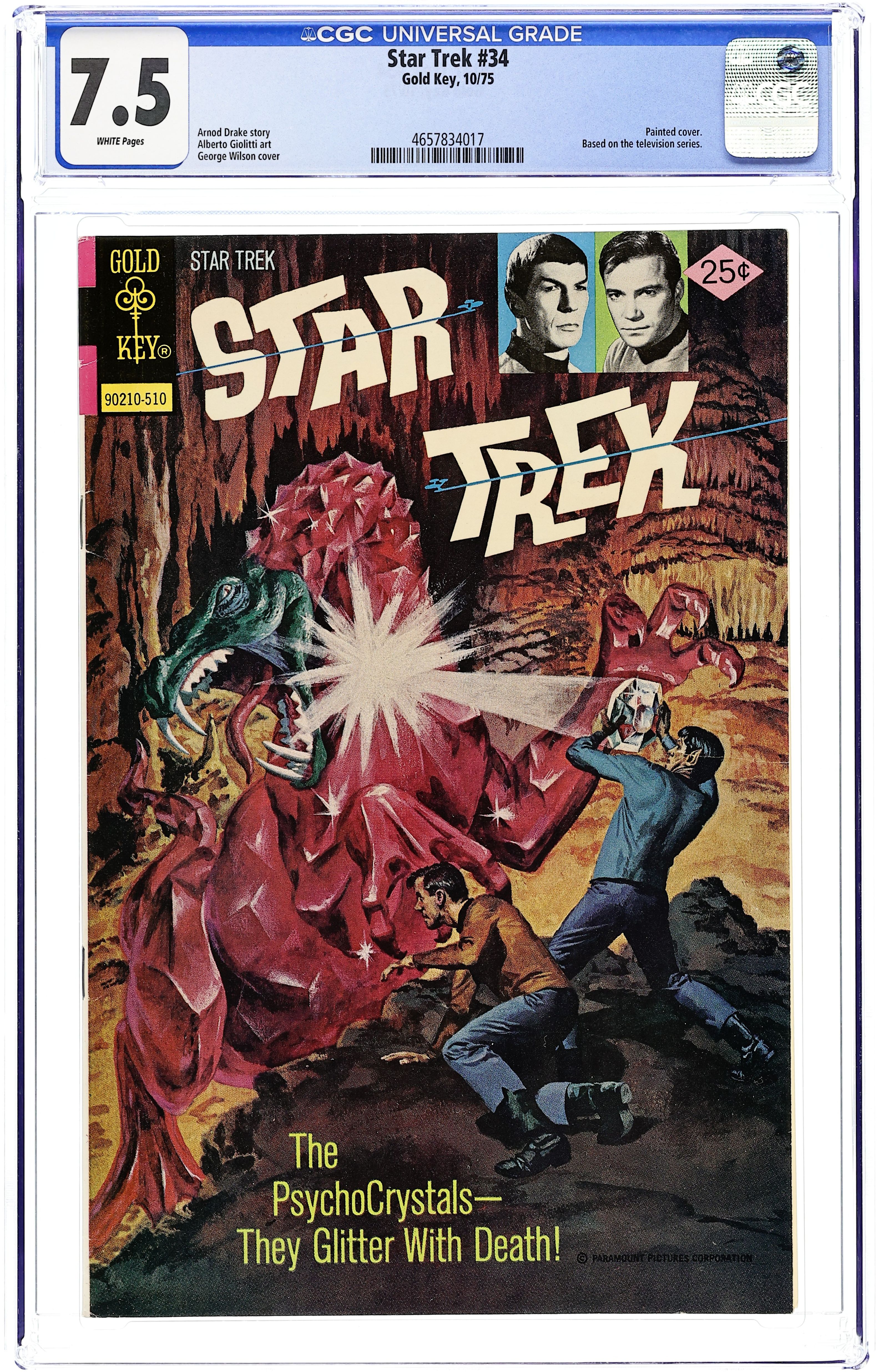 Starts Dec 22 Comic book version of the original Star Trek TV series that starred William Shatner and Leonard Nimoy. 90210-510. Painted cover by George Wilson, with inset photos of William Shatner as Kirk and Leonard Nimoy as Spock. "The Psychocrystals," script by Arnold Drake, art by Albert Giolitti; Kirk, Scotty, Bones and Spock must destroy a beast that feeds on living crystals, or be executed for crimes they didn't commit! Cover price $0.25.