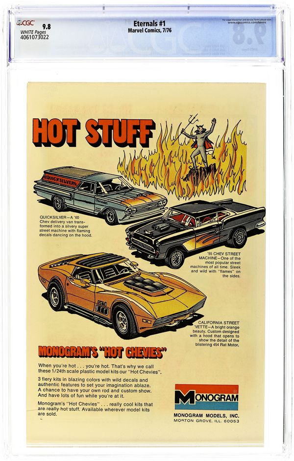 "Big City Crypt." Written by Jack Kirby. Pencils by Jack Kirby. Inks by Mike Royer. Zuras, immortal ruler of the Eternals, attempts to quell the rage of the Cosmic Hulk. However, the Eternals will soon learn that another far greater threat is about to arise... Cover price $0.30.