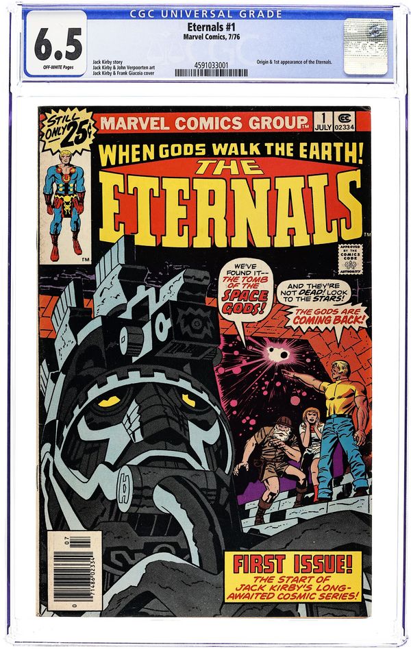 "The Day of the Gods." Written by Jack Kirby. Pencils by Jack Kirby. Inks by John Verpoorten. What if all the stories were true? All myths...all the legends... What if all the stories about gods and monsters were true? For archeologist Doctor Damian and his daughter Margo, those legends are about to become reality. The gods are real and they've lived among us for centuries. 1st appearance of Ikaris, Makkari, Kro and the Eternals as a team . 36 pages, full color. Cover price $0.25.