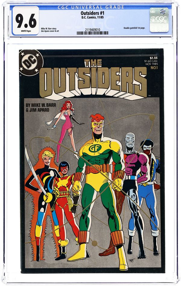 The Outsiders face the Nuclear Family in "Nuclear Fear, Part 1: Beginning With A Bang!" Part 1 of 2, continues next issue. Script by Mike W. Barr, art by Jim Aparo. First 6 pages fold out into gatefold. 31 pages of story. Back-up tale: Halo stars in the 1-page "Statue of Limitations!" by Barr and Aparo. Aparo cover. Cover price $1.25.