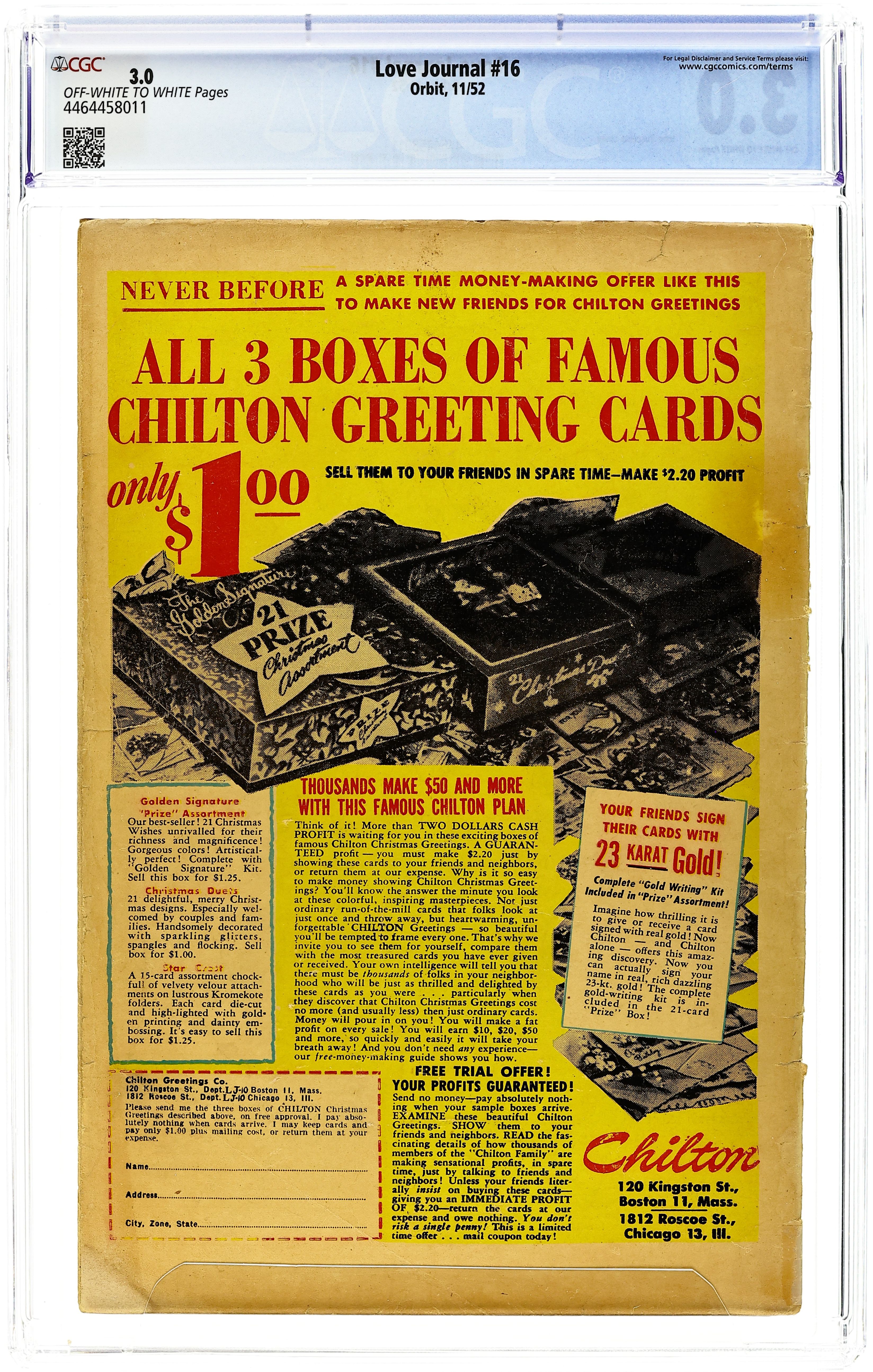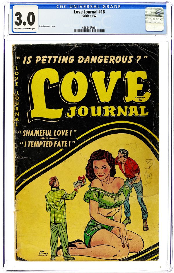 Cover by John Buscema. Stories and art by John Buscema, Mort Leav, Syd Shores and Bill Woolfolk. Offbeat romance comic, from pioneering female publisher Rae Herman of Orbit-Wanted, often featured early work by future comics legends. Betty seeks advice from Love Journal when she fears her marriage-minded mother will scare off her new boyfriend, in an early story (and cute good-girl cover) by future Marvel and Conan legend John Buscema. Elaine is torn between Vince, her childhood pal and would-be fiance, and wealthy playboy Roy. Gloria is ready to start dating her handsome neighbor Doug, until she meets Doug's fiancee Rosa. Plus an advice column on the dangers of "petting," showcasing the values of the time. Shameful Love; Ten O'Clock Town; SOS for Love!; I Tempted Fate. 36 pages, Full Color. Cover price $0.10.
