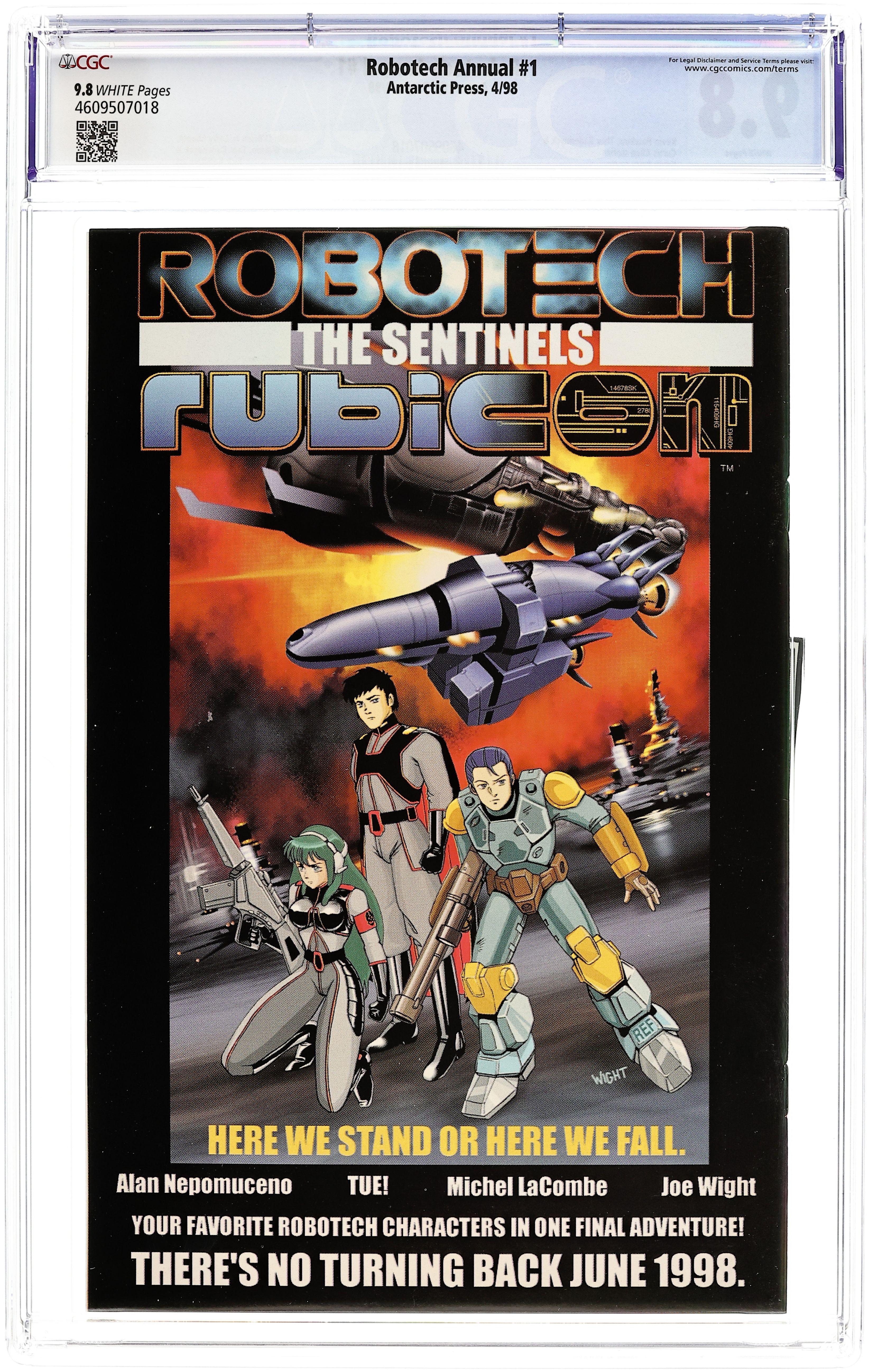 Stories by Curtis Allen and Thor Badendyck. Art by Lester OBrien Jr. and Thor Badendyck. Cover by Jochen Weltjens. Antarctic Press presents new stories based on the beloved anime series. The Annual features stories spanning the Robotech timeline, from Macross to Robotech Masters to the New Generation. A deadly sleeper agent stalks the halls of the SDF-1; Nova and Louie join forces to stop a series of terrorist attacks on Southern Cross bases; Scott and Rand race against time to master their Cyclone Armor before the Invid catch up to them. The First Person; The Science of Law; Shop Talk, or Why You Should Never Ride Without a Helmet. 32 pages, B&W. Cover price $2.95.