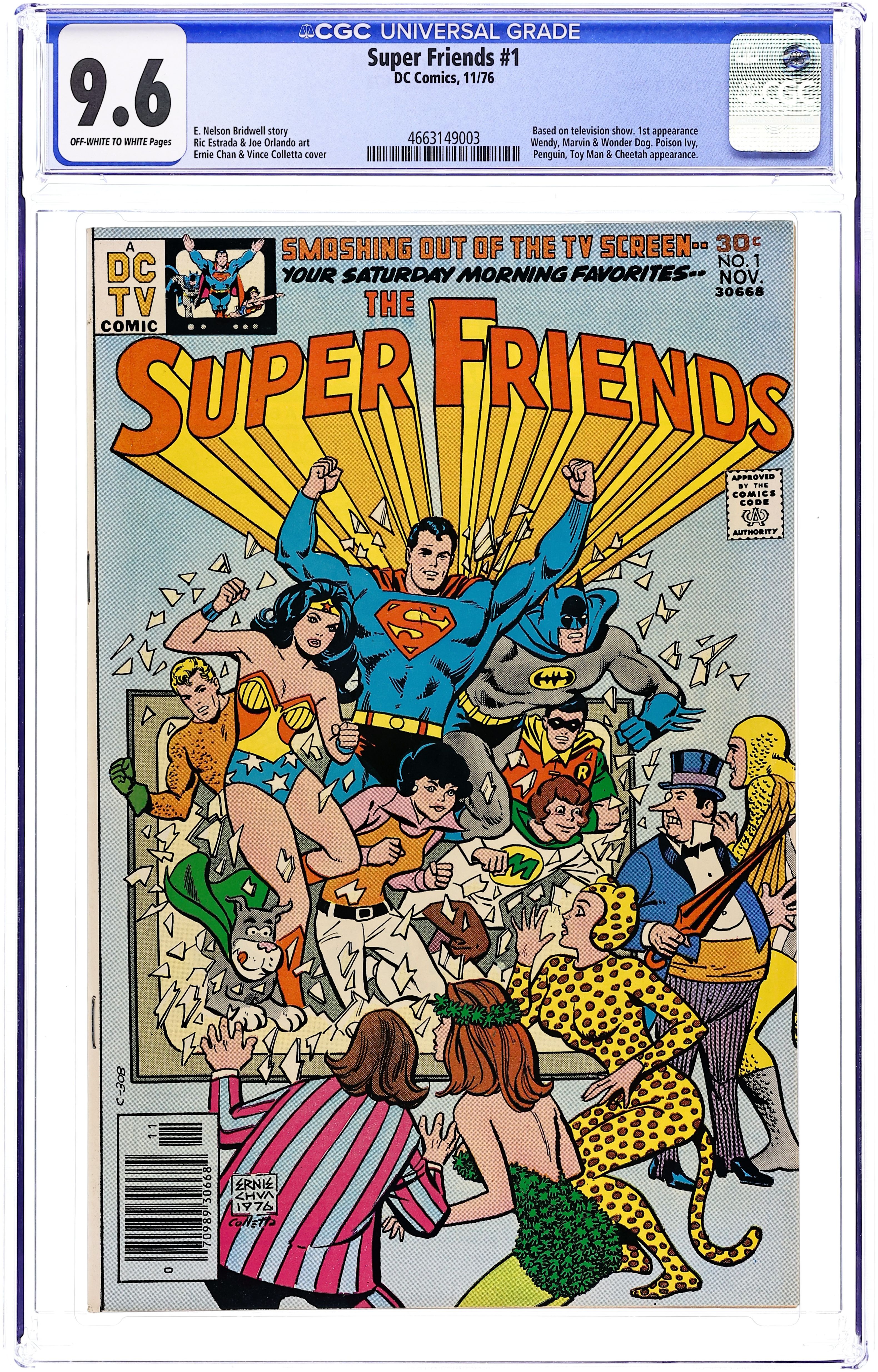 "The Fury of the Super Foes." Aquaman, Batman, Robin, Superman and Wonder Woman attempt to prevent Penguin, Poison Ivy, Cheetah, and others from stealing the components of a super robot. The Super Friends, which are essentially a watered down version of the Justice League, appeared in the Saturday morning animated series of the same name. Script by E. Nelson Bridwell, pencils by Ric Estrada and Joe Orlando, inks by Vince Colletta. Cover by Ernie Chua. Cover price $0.30.