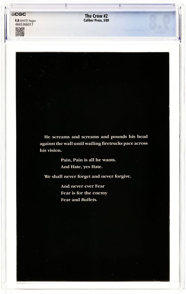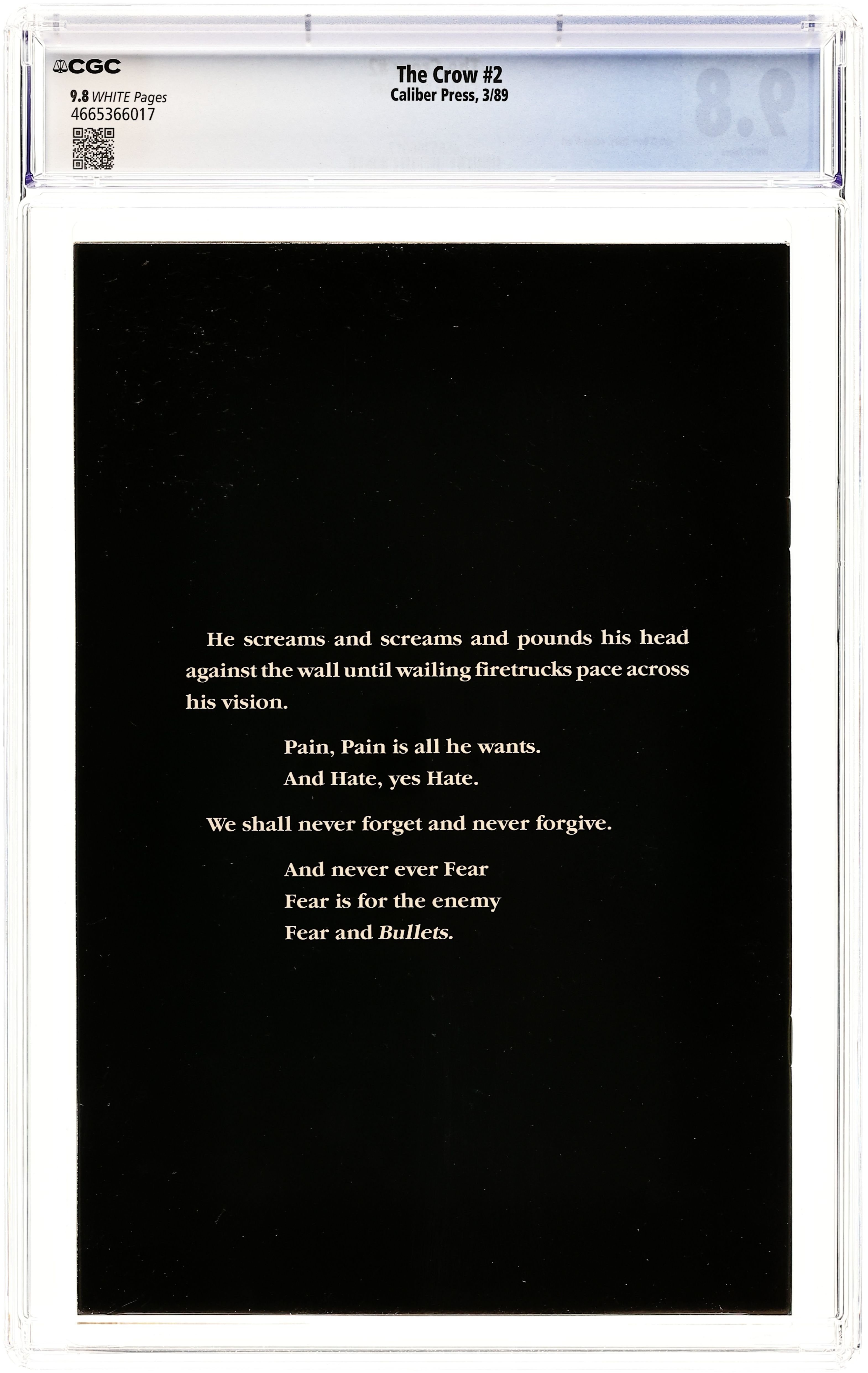 SECOND PRINTING dated October 1989. Book One: Pain. Story, art and cover by James O'Barr. The first Crow miniseries, and the characters second appearance (after Caliber Presents #1). Murdered by thugs, Eric Draven is resurrected as The Crow, a deathless spirit of vengeance. 32 pages, B&W. Mature Reader NOTE: The 1st printing was dated February 1989. Cover price $1.95.