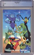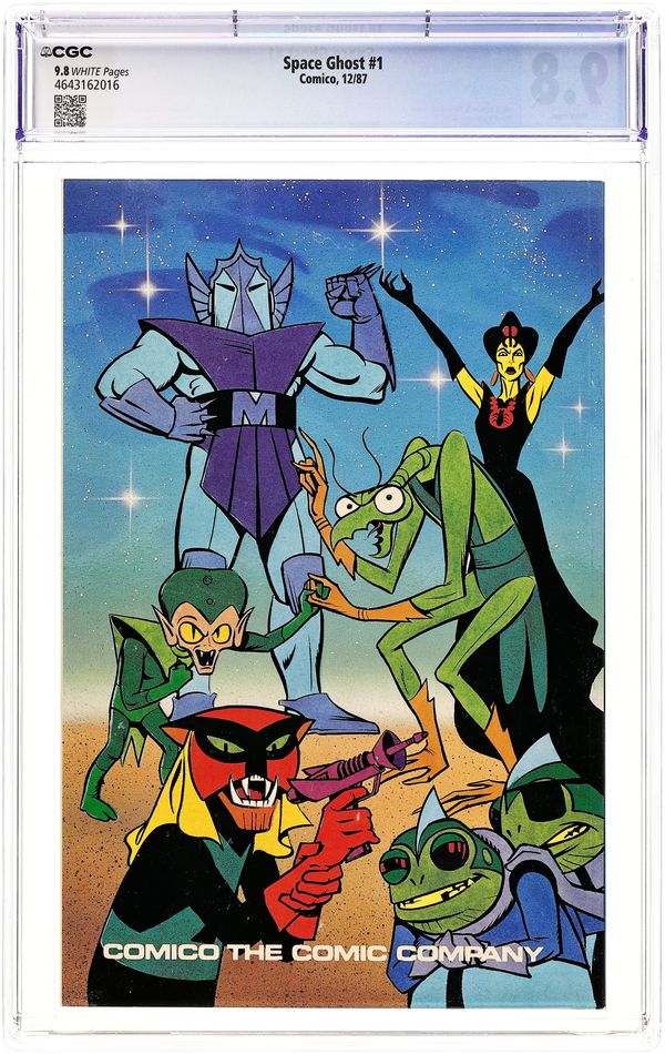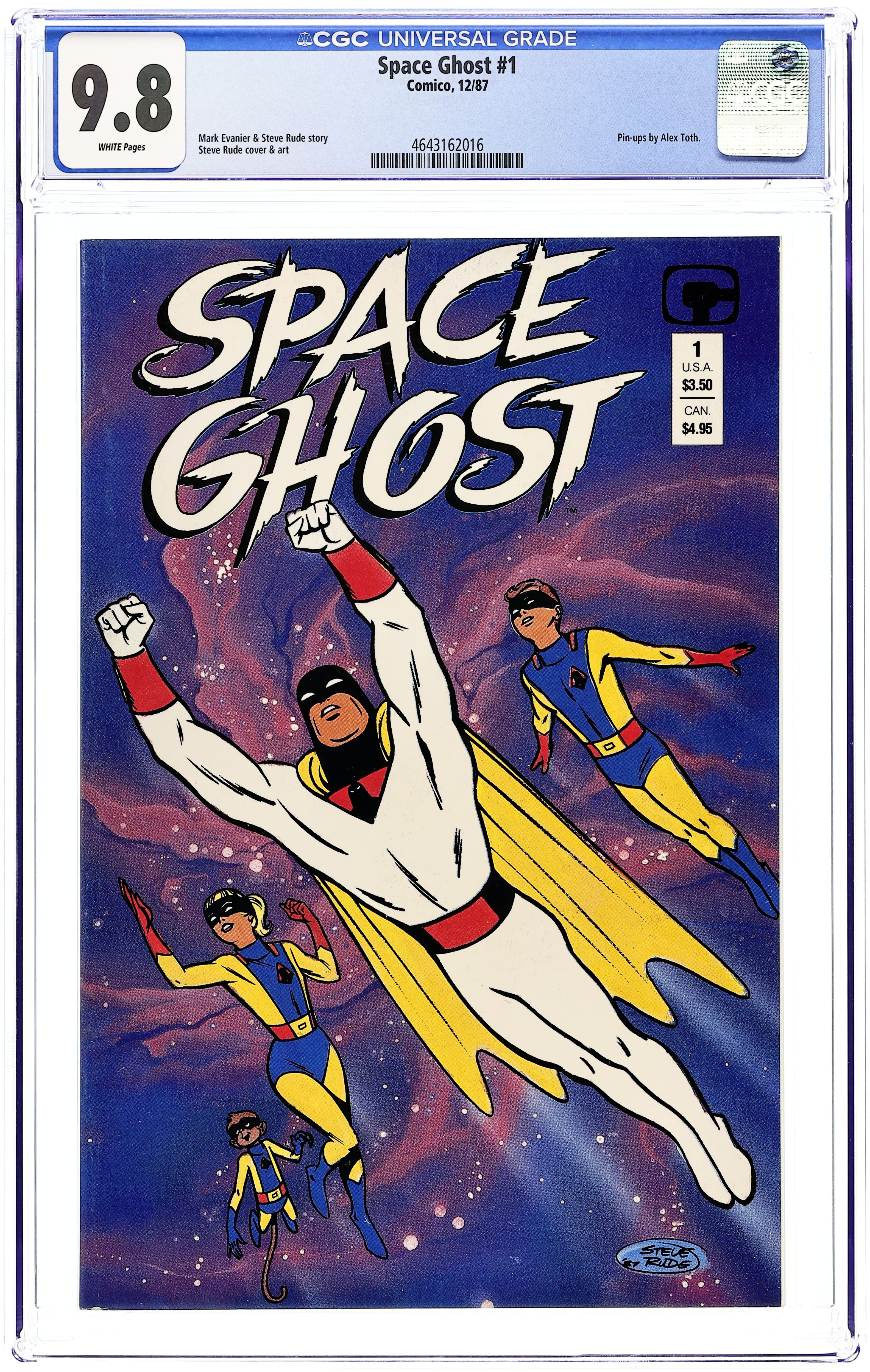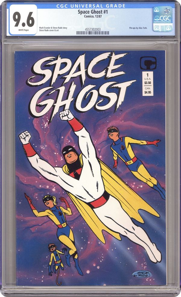 "The Sinister Spectre." Story by Mark Evanier and Steve Rude. Pencils, front and back cover by Steve Rude. Inks by Willie Blyberg. Painted color by Ken Steacy. A mysterious figure breaks Space Ghosts most dangerous foes out of Gaolworld. It will take the combined power and ingenuity of Space Ghost, Jan and Jace, and Blip the monkey to recapture them. However, even if they do, they still have to face the hooded figure who freed them. While the face behind that hood is the last one anyone would expect. Contains a 5 page article on the development of the original Space Ghost cartoons by Mark Evanier. 48 pages. Square bound. Full painted color. Cover price $3.50.