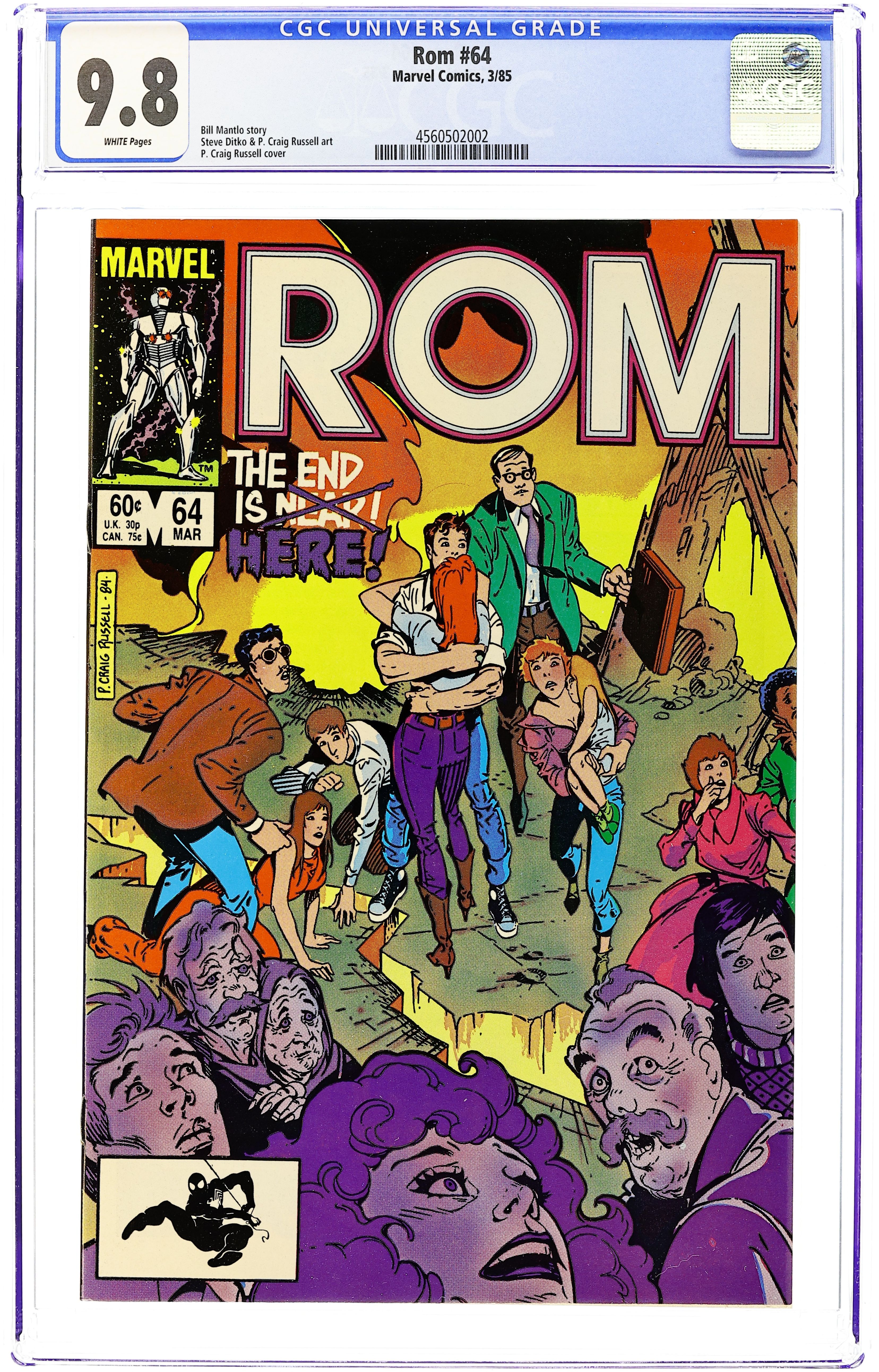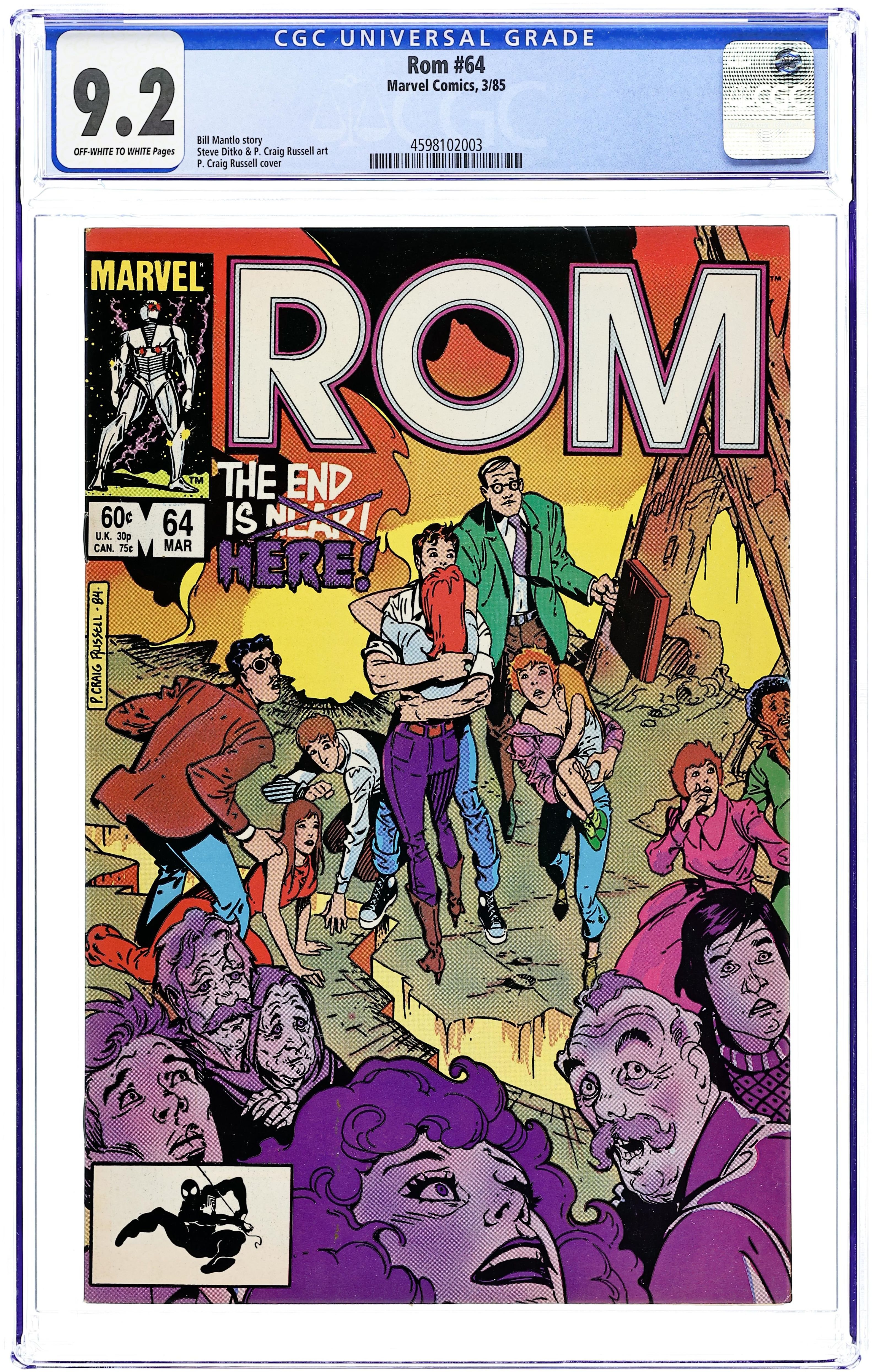 Direct Edition. Guest-starring everybody. Story by Bill Mantlo. Art by Steve Ditko and P. Craig Russell. The end is near. Nay, true-believer...the end is here. This is it...the Final Conflict. Rom is defeated and victory is within the grasp of the evil Dire Wraiths. However, one last thing stands in their way and total victory, the united governments of the Earth and oh yeah, all those pesky super-heroes Rom has spent the last 64 issues recruiting to his cause. Rom is joined by the Avengers, the West Coast Avengers, the X-Men, the Defenders, the Soviet Super-Soldiers and all of the heroes of the world in one last ultimate battle to rid the Earth of Wraithkind forever. It's all or nothing...there's no turning back now. The war and the fate of mankind is decided in this epic issue. 32 pages. Cover price $0.65.