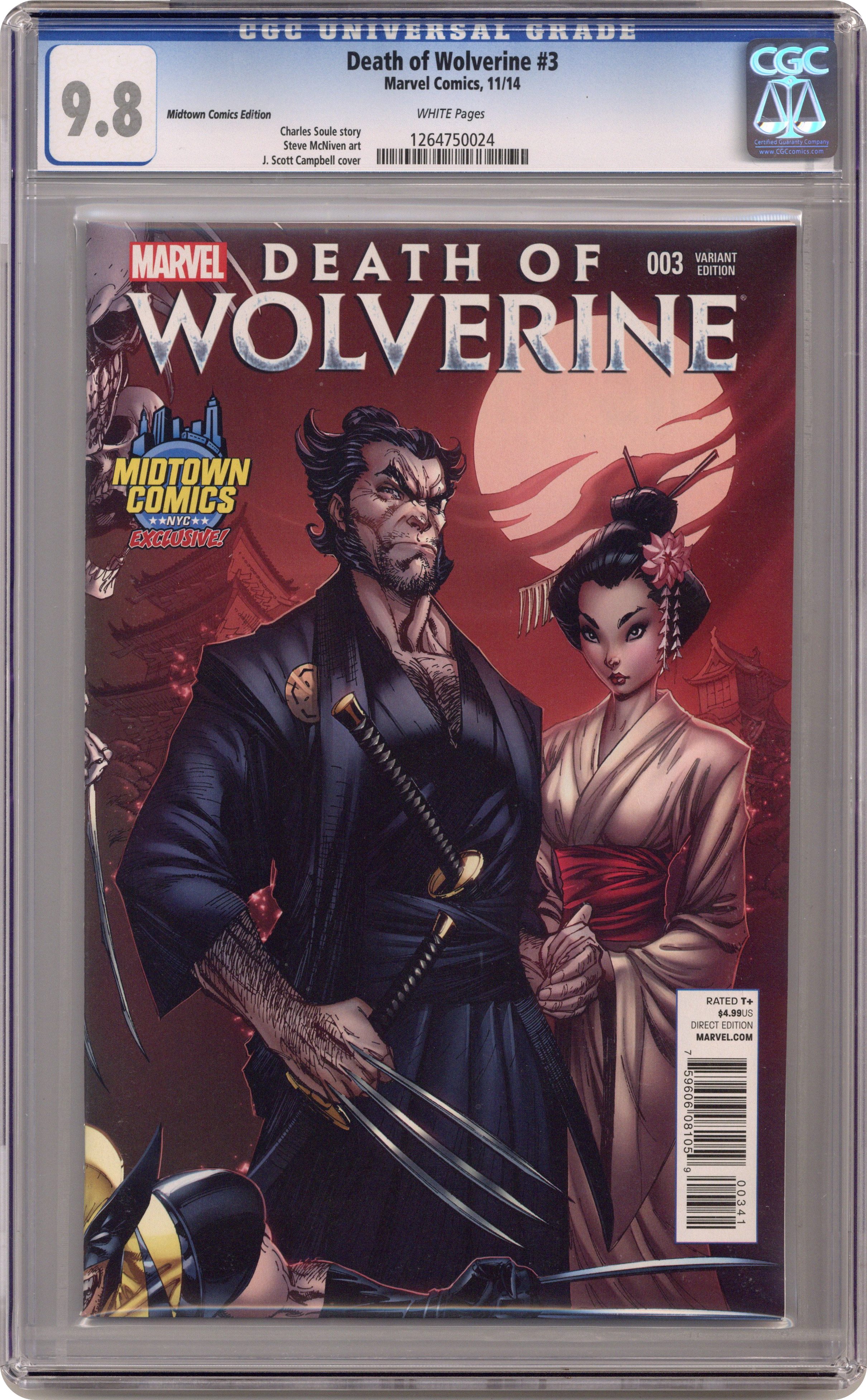 Midtown Comics Connecting Variant Cover by J. Scott Campbell (Midtown #1-4 variant covers interlock together). Written by Charles Soule. Art by Steve McNiven. IT'S THE BEGINNING OF THE END - 3 MONTHS TO DIE ENDS HERE! The beginning of the end is now here ... THE DEATH OF WOLVERINE! THREE MONTHS TO DIE, the loss of Wolverine's healing factor--all led to this, the single most important X-Men event of the decade. Logan has spent over a century being the best there is at what he does...but even the best fade away eventually. Over the years, Logan has been a warrior, a hero, a renegade, a samurai, a teacher-and so much more. But now, the greatest X-Men hero will play a role he's never played before. 40 pages, full color. Rated T+