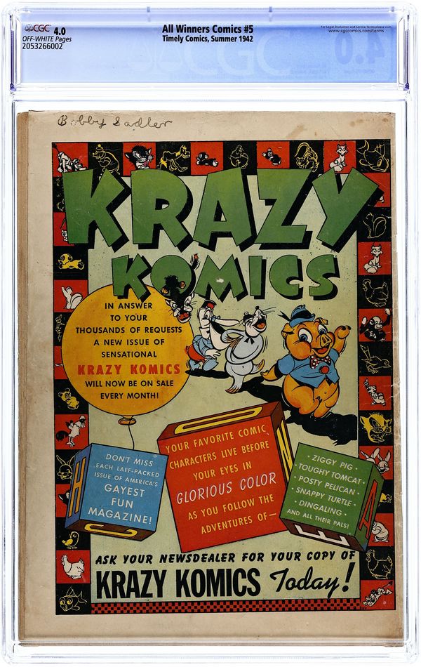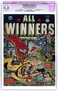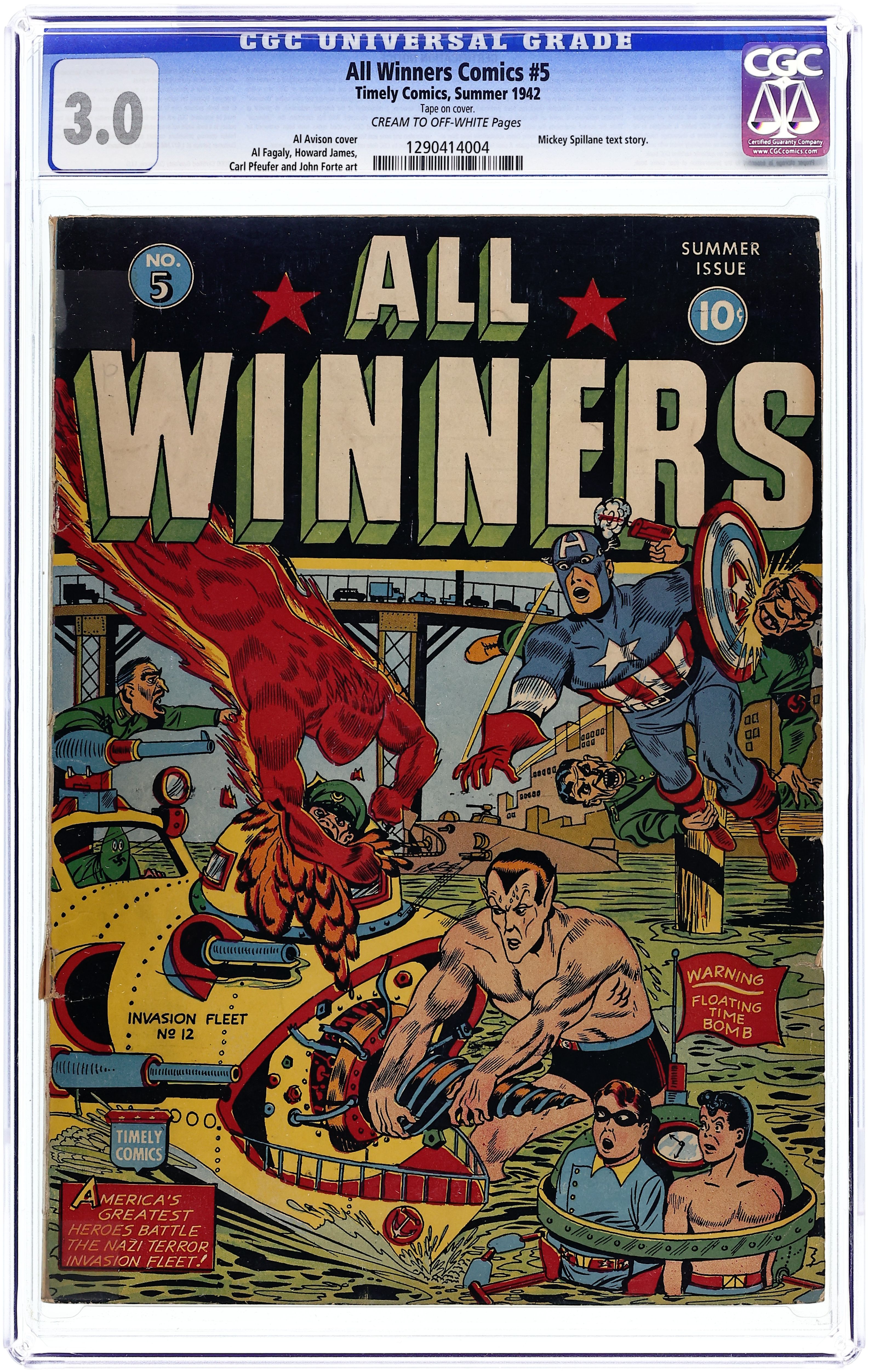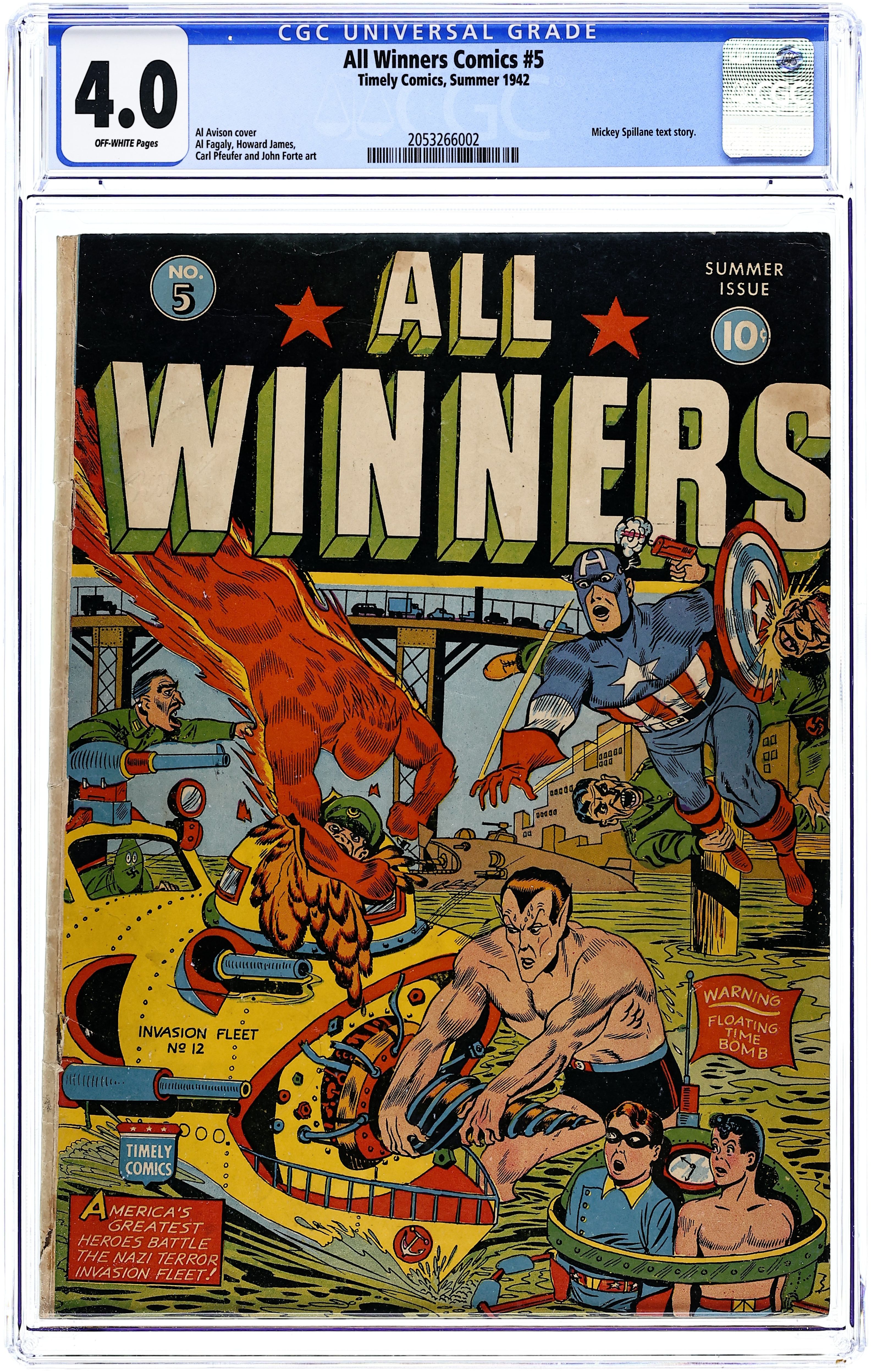 The Crime of the Ages!, script by Bill Finger, pencils by Syd Shores, inks by Al Avison; The All-Winners Squad is hurriedly called to meet with the curator of a museum, whose exhibit, "The Ages of Mankind", has been smashed. The Age of Bronze! starring Captain America, script by Bill Finger, pencils by Vince Alascia, inks by Bob Powell; Cap and Bucky head to a museum of art to locate a valuable piece of bronze art and find the "Idol With the Starry Eyes".....a bronze idol that actually has star sapphires for eyes. The Iron Age! starring The Whizzer, script by Bill Finger, pencils by Al Avison, inks by Al Gabriele. The Steel Age (Chapter 4) starring The Human Torch, script by Bill Finger, pencils by Al Avison, inks by Don Rico. The Stone Age (Chapter 5) starring Miss America, script by Bill Finger, pencils by Syd Shores, inks by Vince Alascia. The Ice Age! (Chapter 6) starring the Sub-Mariner, script by Bill Finger, pencils by Bob Powell, inks by Al Avison. Conclusion! (Chapter 7) starring the All-Winners Squad, script by Bill Finger, pencils by Al Avison, inks by Al Bellman. 52 pages, full color. Cover price $0.10.
