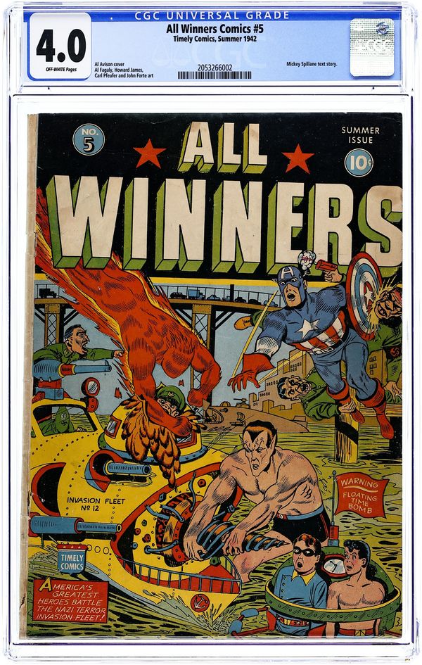 Invading the Nazis' Secret Plan, inks by Carl Burgos; Torch and Toro discover that the Nazis are operating out of a steamship anchored to a pier at Coney Island, intending to deliver a bomb [along with needed tanks of oxygen] to a hospital in order to kill thousands. Ad encouraging readers to join Cap's Sentinels of Liberty. The Vampire Strikes!, pencils by Al Avison, inks by Don Rico; Cap and Bucky must face the threat created by the world's greatest master of occult medicine, Dr. Togu, who has forsaken the dropping of disease bombs on the Chinese people to inflict yet a new terror upon America: a vampire! Speed On the Rampage starring the Whizzer, art by Howard James. The Man in the Moon text story by Mickey Spillane. The Hermit's Island of Glittering Gold starring Sub-Mariner, pencils by Bill Everett. The Demon's Deadly Secret starring the Destroyer, art by John Forte. 68 pages, full color. Cover price $0.10.